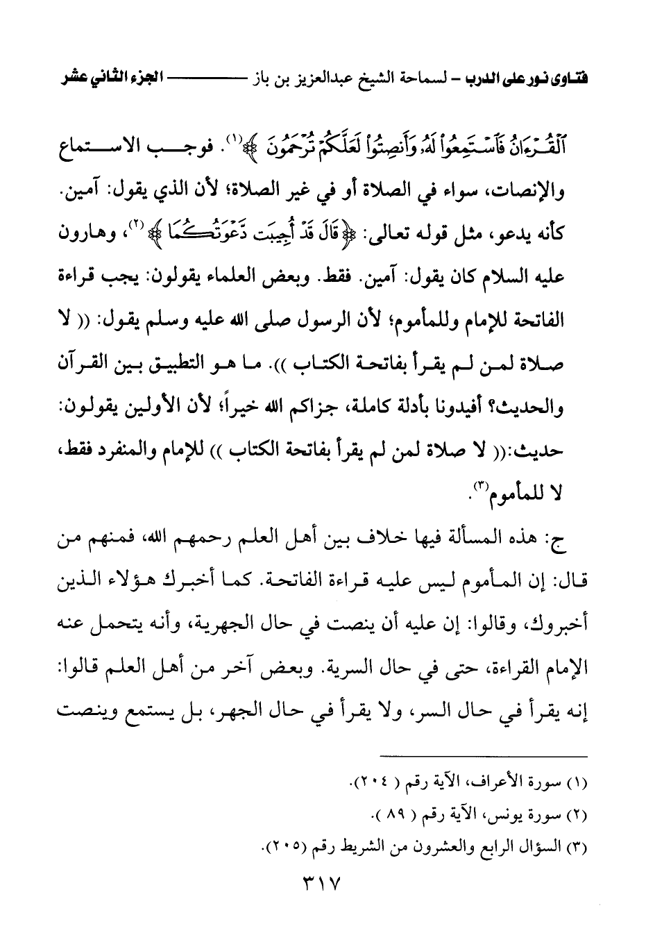 فوجب الاستماع والإنصات، سواء في الصلاة أو في غير الصلاة؛ لأن الذي يقول: آمين. كأنه يدعو، مثل قوله تعالى: {قَالَ قَدْ أُجِيبَتْ دَعْوَتُكُمَا} (¬1)، وهارون عليه السلام كان يقول: آمين. فقط. وبعض العلماء يقولون: يجب قراءة الفاتحة للإمام وللمأموم؛ لأن الرسول صلى الله عليه وسلم يقول: «لا صلاة لمن لم يقرأ بفاتحة الكتاب (¬2)». ما هو التطبيق بين القرآن والحديث؟ أفيدونا بأدلة كاملة، جزاكم الله خيرا؛ لأن الأولين يقولون: حديث: «لا صلاة لمن لم يقرأ بفاتحة الكتاب (¬3)» للإمام والمنفرد فقط، لا للمأموم (¬4)
