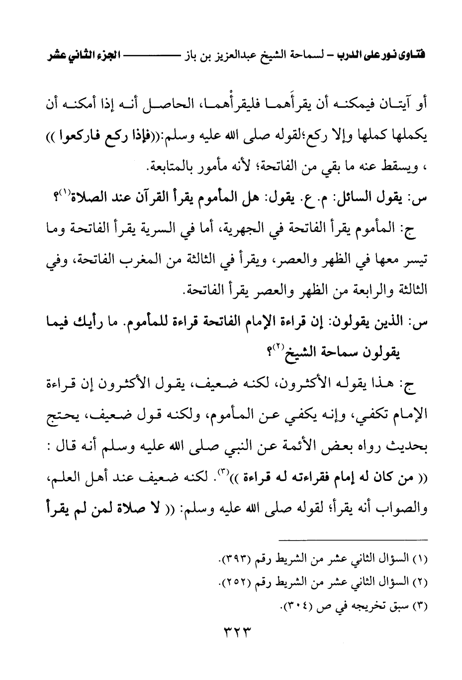 ج: هذا يقوله الأكثرون، لكنه ضعيف، يقول الأكثرون إن قراءة الإمام تكفي، وإنه يكفي عن المأموم، ولكنه قول ضعيف، يحتج بحديث رواه بعض الأئمة عن النبي صلى الله عليه وسلم أنه قال: «من كان له إمام فقراءته له قراءة (¬2)» لكنه ضعيف عند أهل العلم، والصواب أنه يقرأ؛ لقوله صلى الله عليه وسلم: «لا صلاة لمن لم يقرأ