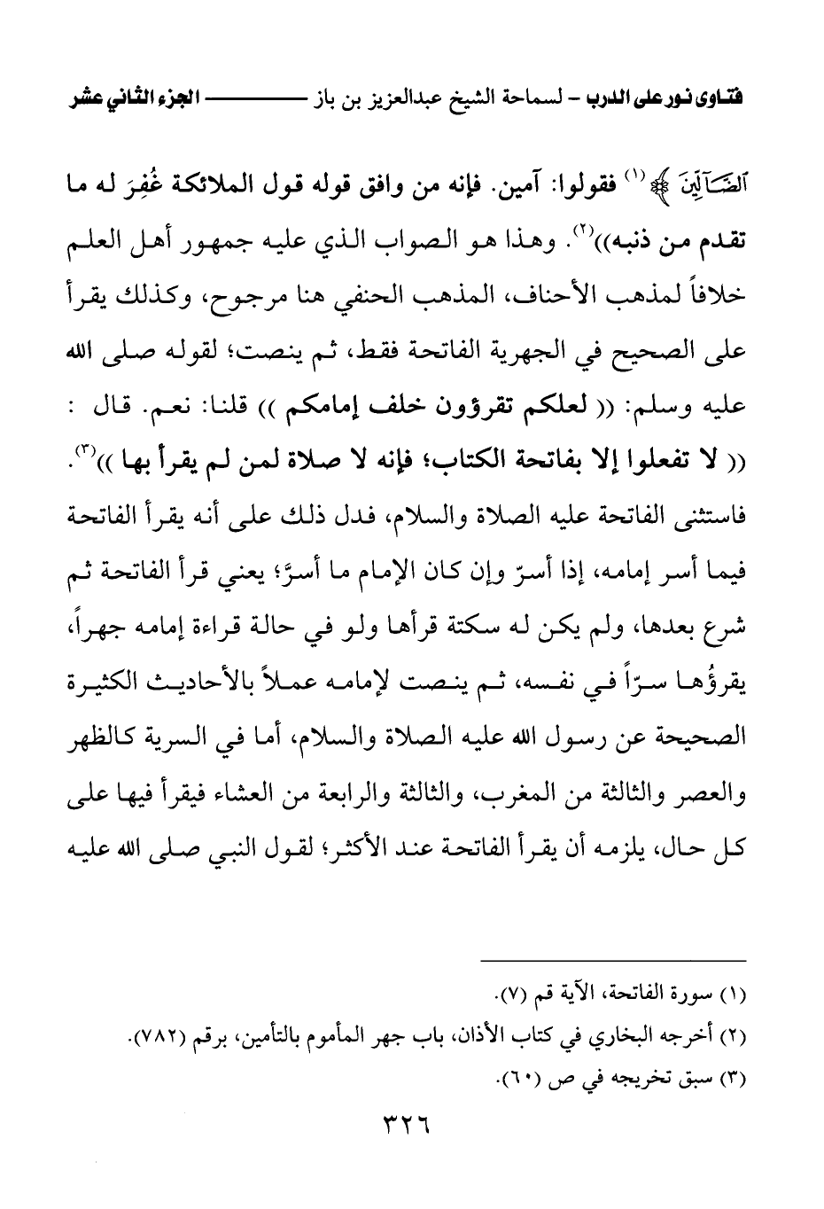 فقولوا: آمين. فإنه من وافق قوله قول الملائكة غفر له ما تقدم من ذنبه (¬1)» وهذا هو الصواب الذي عليه جمهور أهل العلم خلافا لمذهب الأحناف، المذهب الحنفي هنا مرجوح، وكذلك يقرأ على الصحيح في الجهرية الفاتحة فقط، ثم ينصت؛ لقوله صلى الله عليه وسلم: «لعلكم تقرؤون خلف إمامكم قلنا: نعم. قال: لا تفعلوا إلا بفاتحة الكتاب؛ فإنه لا صلاة لمن لم يقرأ بها (¬2)» فاستثنى الفاتحة عليه الصلاة والسلام، فدل ذلك على أنه يقرأ الفاتحة فيما أسر إمامه، إذا أسر وإن كان الإمام ما أسر؛ يعني قرأ الفاتحة ثم شرع بعدها، ولم يكن له سكتة قرأها ولو في حالة قراءة إمامه جهرا، يقرؤها سرا في نفسه، ثم ينصت لإمامه عملا بالأحاديث الكثيرة الصحيحة عن رسول الله عليه الصلاة والسلام، أما في السرية كالظهر والعصر والثالثة من المغرب، والثالثة والرابعة من العشاء فيقرأ فيها على كل حال، يلزمه أن يقرأ الفاتحة عند الأكثر؛ لقول النبي صلى الله عليه