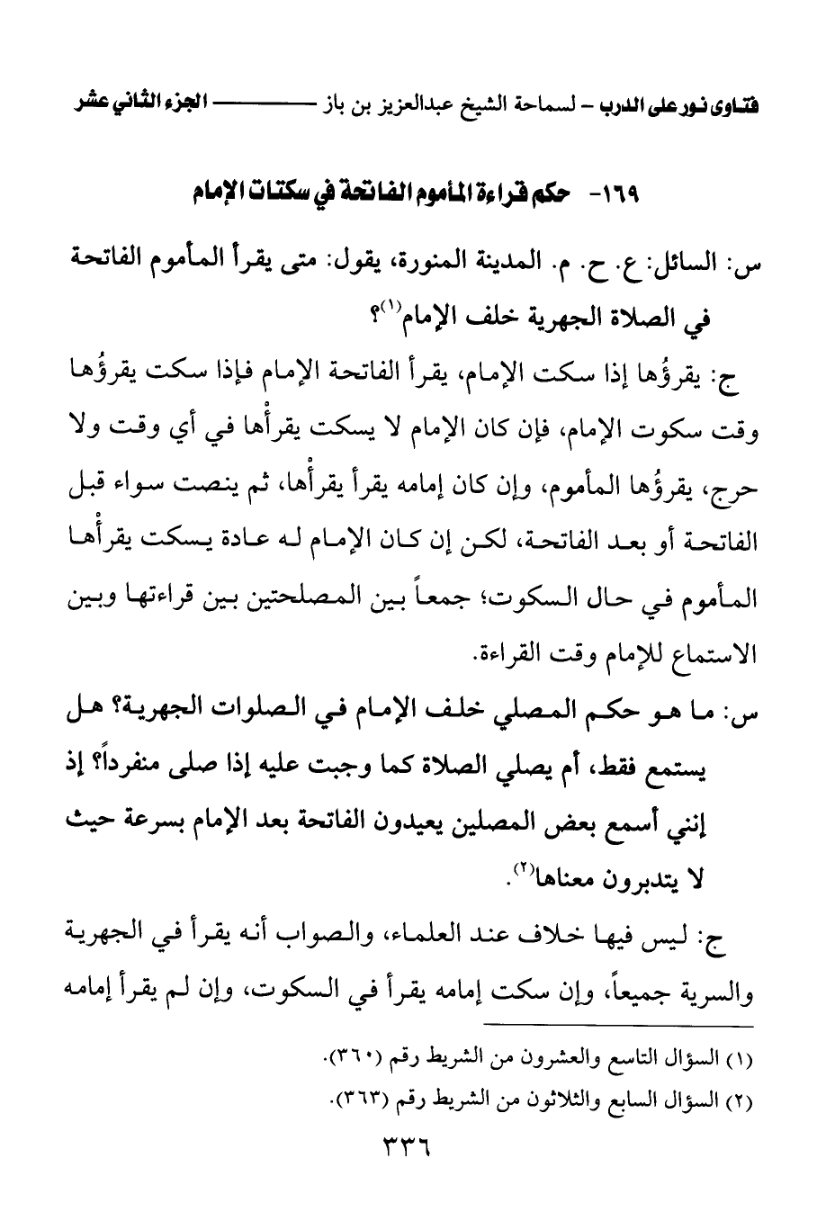 س: السائل: ع. ح. م. المدينة المنورة، يقول: متى يقرأ المأموم الفاتحة في الصلاة الجهرية خلف الإمام (¬1)