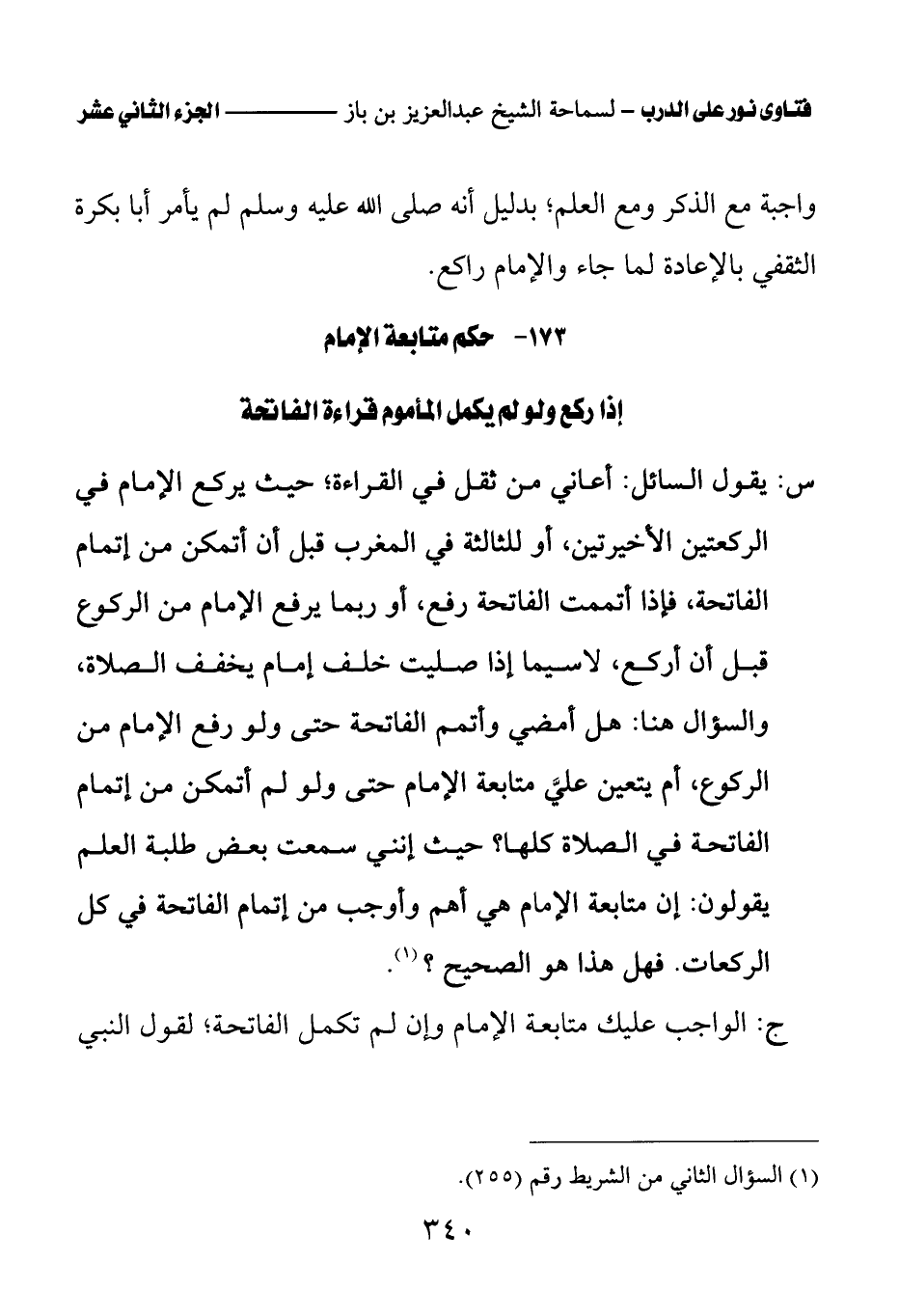 173 - حكم متابعة الإمام إذا ركع ولو لم يكمل المأموم قراءة الفاتحة