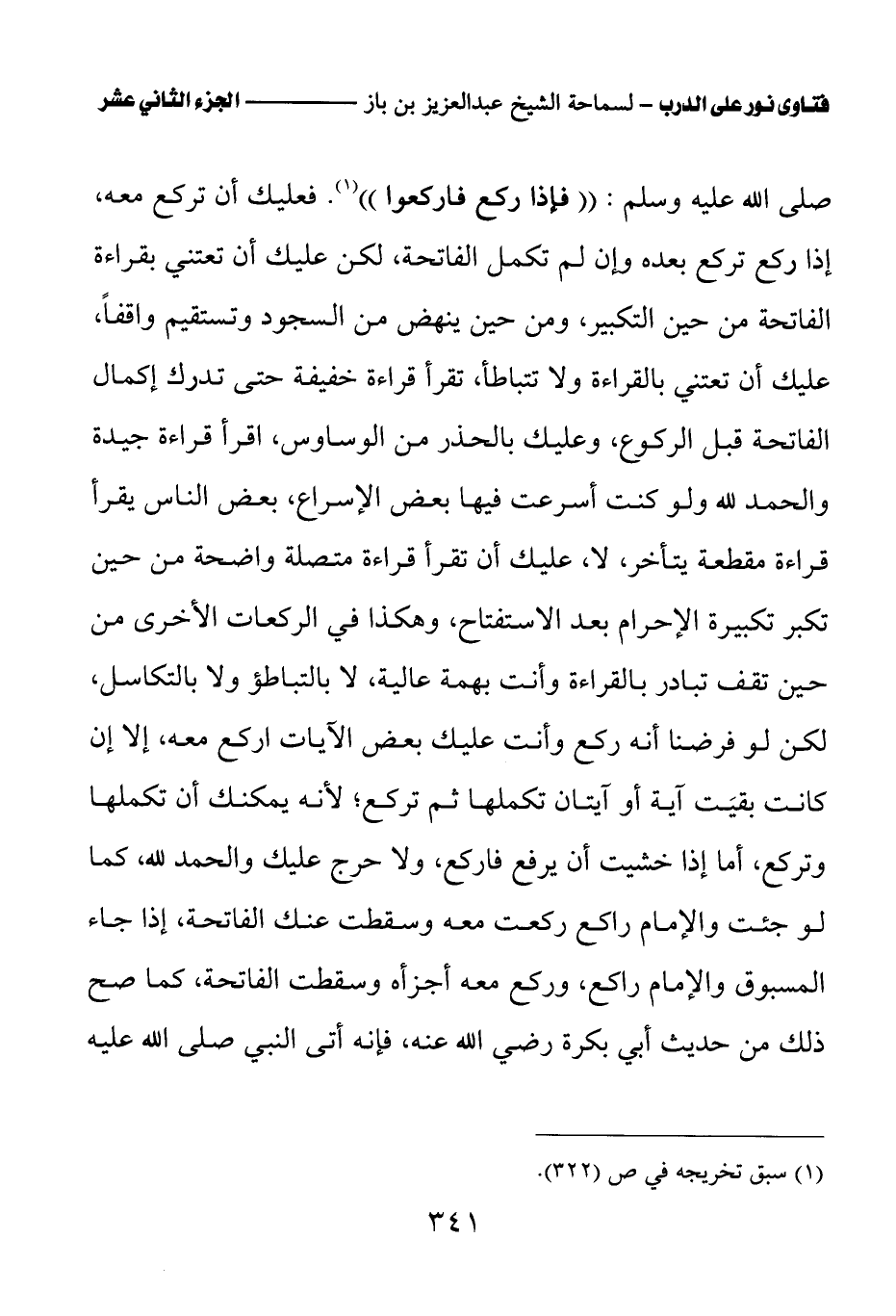 صلى الله عليه وسلم: «فإذا ركع فاركعوا (¬1)» فعليك أن تركع معه، إذا ركع تركع بعده وإن لم تكمل الفاتحة، لكن عليك أن تعتني بقراءة الفاتحة من حين التكبير، ومن حين ينهض من السجود وتستقيم واقفا، عليك أن تعتني بالقراءة ولا تتباطأ، تقرأ قراءة خفيفة حتى تدرك إكمال الفاتحة قبل الركوع، وعليك بالحذر من الوساوس، اقرأ قراءة جيدة والحمد لله ولو كنت أسرعت فيها بعض الإسراع، بعض الناس يقرأ قراءة مقطعة يتأخر، لا، عليك أن تقرأ قراءة متصلة واضحة من حين تكبر تكبيرة الإحرام بعد الاستفتاح، وهكذا في الركعات الأخرى من حين تقف تبادر بالقراءة وأنت بهمة عالية، لا بالتباطؤ ولا بالتكاسل، لكن لو فرضنا أنه ركع وأنت عليك بعض الآيات اركع معه، إلا إن كانت بقيت آية أو آيتان تكملها ثم تركع؛ لأنه يمكنك أن تكملها وتركع، أما إذا خشيت أن يرفع فاركع، ولا حرج عليك والحمد لله، كما لو جئت والإمام راكع ركعت معه وسقطت عنك الفاتحة، إذا جاء المسبوق والإمام راكع، وركع معه أجزأه وسقطت الفاتحة، كما صح ذلك من حديث أبي بكرة رضي الله عنه، فإنه أتى النبي صلى الله عليه