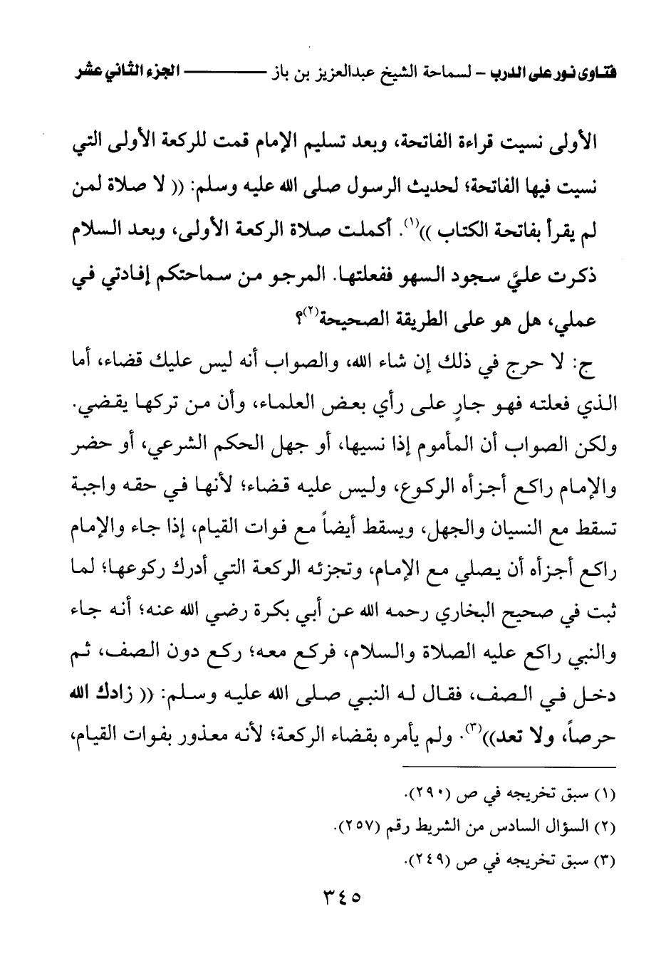 ج: لا حرج في ذلك إن شاء الله، والصواب أنه ليس عليك قضاء، أما الذي فعلته فهو جار على رأي بعض العلماء، وأن من تركها يقضي. ولكن الصواب أن المأموم إذا نسيها، أو جهل الحكم الشرعي، أو حضر والإمام راكع أجزأه الركوع، وليس عليه قضاء؛ لأنها في حقه واجبة تسقط مع النسيان والجهل، ويسقط أيضا مع فوات القيام، إذا جاء والإمام راكع أجزأه أن يصلي مع الإمام، وتجزئه الركعة التي أدرك ركوعها؛ لما ثبت في صحيح البخاري رحمه الله عن أبي بكرة رضي الله عنه؛ أنه جاء والنبي راكع عليه الصلاة والسلام، فركع معه؛ ركع دون الصف، ثم دخل في الصف، فقال له النبي صلى الله عليه وسلم: «زادك الله حرصا، ولا تعد (¬3)» ولم يأمره بقضاء الركعة؛ لأنه معذور بفوات القيام،