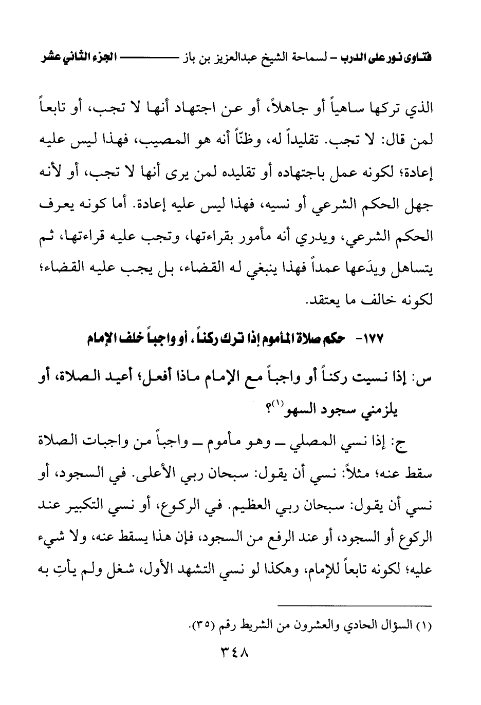س: إذا نسيت ركنا أو واجبا مع الإمام ماذا أفعل؛ أعيد الصلاة، أو يلزمني سجود السهو (¬1)