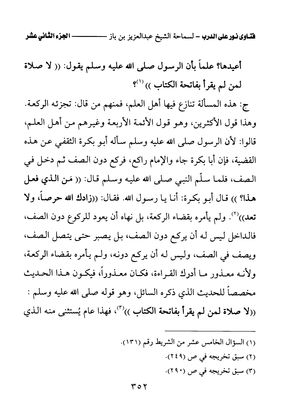 ج: هذه المسألة تنازع فيها أهل العلم، فمنهم من قال: تجزئه الركعة. وهذا قول الأكثرين، وهو قول الأئمة الأربعة وغيرهم من أهل العلم، قالوا: لأن الرسول صلى الله عليه وسلم سأله أبو بكرة الثقفي عن هذه القضية، «فإن أبا بكرة جاء والإمام راكع، فركع دون الصف ثم دخل في الصف، فلما سلم النبي صلى الله عليه وسلم قال: " من الذي فعل هذا؟ " قال أبو بكرة: أنا يا رسول الله. فقال: " زادك الله حرصا، ولا تعد (¬2)» ولم يأمره بقضاء الركعة، بل نهاه أن يعود للركوع دون الصف، فالداخل ليس له أن يركع دون الصف، بل يصبر حتى يتصل الصف، ويصف في الصف، وليس له أن يركع دونه، ولم يأمره بقضاء الركعة، ولأنه معذور ما أدرك القراءة، فكان معذورا، فيكون هذا الحديث مخصصا للحديث الذي ذكره السائل، وهو قوله صلى الله عليه وسلم: