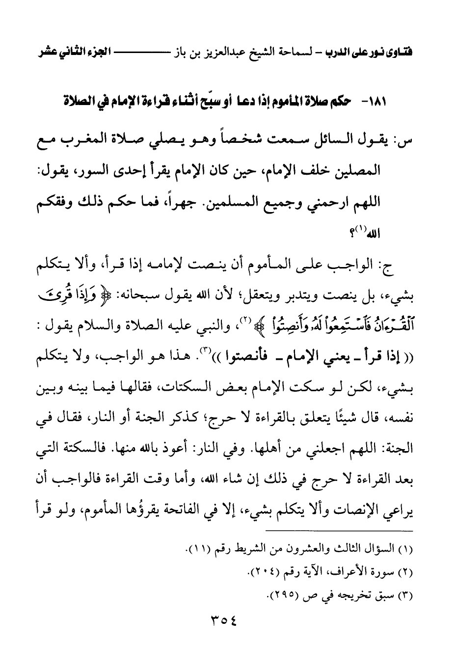 181 - حكم صلاة المأموم إذا دعا أو سبح أثناء قراءة الإمام في الصلاة