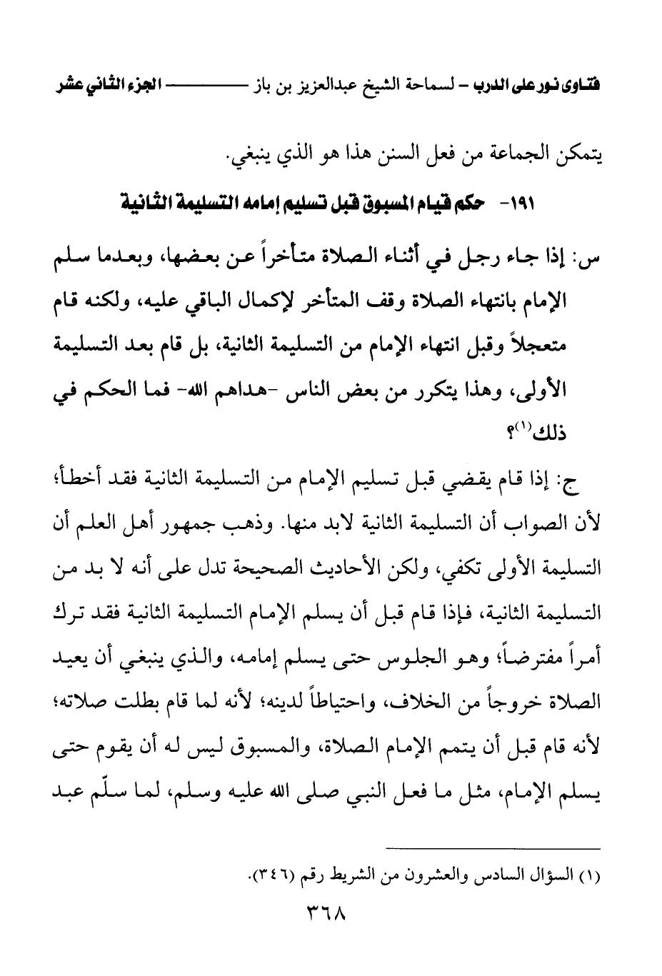 191 - حكم قيام المسبوق قبل تسليم إمامه التسليمة الثانية