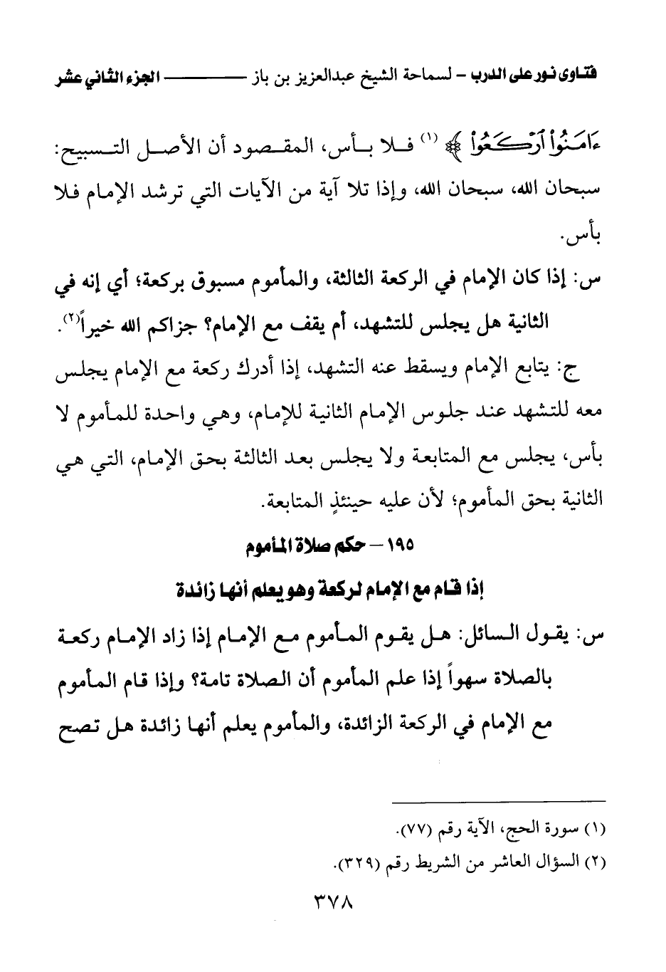 195 - حكم صلاة المأموم إذا قام مع الإمام لركعة وهو يعلم أنها زائدة
