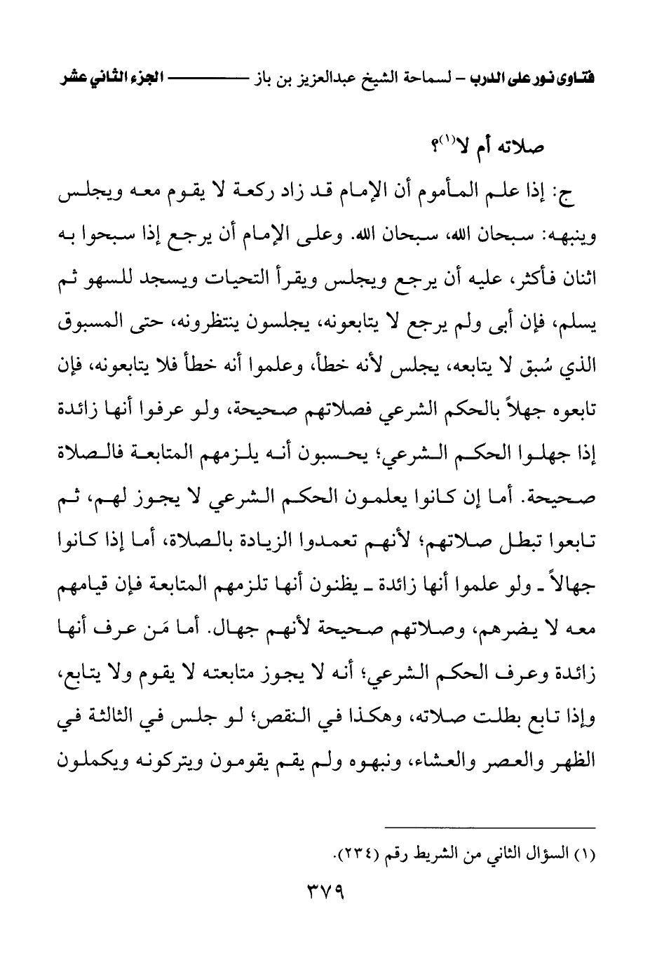 ج: إذا علم المأموم أن الإمام قد زاد ركعة لا يقوم معه ويجلس وينبهه: سبحان الله، سبحان الله. وعلى الإمام أن يرجع إذا سبحوا به اثنان فأكثر، عليه أن يرجع ويجلس ويقرأ التحيات ويسجد للسهو ثم يسلم، فإن أبى ولم يرجع لا يتابعونه، يجلسون ينتظرونه، حتى المسبوق الذي سبق لا يتابعه، يجلس لأنه خطأ، وعلموا أنه خطأ فلا يتابعونه، فإن تابعوه جهلا بالحكم الشرعي فصلاتهم صحيحة، ولو عرفوا أنها زائدة إذا جهلوا الحكم الشرعي؛ يحسبون أنه يلزمهم المتابعة فالصلاة صحيحة. أما إن كانوا يعلمون الحكم الشرعي لا يجوز لهم، ثم تابعوا تبطل صلاتهم؛ لأنهم تعمدوا الزيادة بالصلاة، أما إذا كانوا جهالا ولو علموا أنها زائدة يظنون أنها تلزمهم المتابعة فإن قيامهم معه لا يضرهم، وصلاتهم صحيحة لأنهم جهال. أما من عرف أنها زائدة وعرف الحكم الشرعي؛ أنه لا يجوز متابعته لا يقوم ولا يتابع، وإذا تابع بطلت صلاته، وهكذا في النقص؛ لو جلس في الثالثة في الظهر والعصر والعشاء، ونبهوه ولم يقم يقومون ويتركونه ويكملون