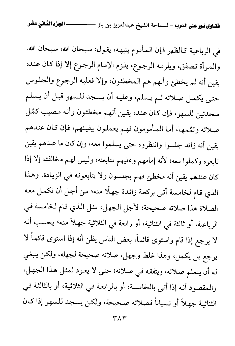 في الرباعية كالظهر فإن المأموم ينبهه، يقول: سبحان الله، سبحان الله. والمرأة تصفق، ويلزمه الرجوع، يلزم الإمام الرجوع إلا إذا كان عنده يقين أنه لم يخطئ وأنهم هم المخطئون، وإلا فعليه الرجوع والجلوس حتى يكمل صلاته ثم يسلم، وعليه أن يسجد للسهو قبل أن يسلم سجدتين للسهو، فإن كان عنده يقين أنهم مخطئون وأنه مصيب كمل صلاته وتممها، أما المأمومون فهم يعملون بيقينهم، فإن كان عندهم يقين أنه زائد جلسوا وانتظروه حتى يسلموا معه، وإن كان ما عندهم يقين تابعوه وكملوا معه؛ لأنه إمامهم وعليهم متابعته، وليس لهم مخالفته إلا إذا كان عندهم يقين أنه مخطئ فهم يجلسون ولا يتابعونه في الزيادة. وهذا الذي قام لخامسة أتى بركعة زائدة جهلا منه؛ من أجل أن تكمل معه الصلاة هذا صلاته صحيحة؛ لأجل الجهل، مثل الذي قام لخامسة في الرباعية، أو ثالثة في الثنائية، أو رابعة في الثلاثية جهلا منه؛ يحسب أنه لا يرجع إذا قام واستوى قائما، بعض الناس يظن أنه إذا استوى قائما لا يرجع بل يكمل، وهذا غلط وجهل، صلاته صحيحة لجهله، ولكن ينبغي له أن يتعلم صلاته، ويتفقه في صلاته؛ حتى لا يعود لمثل هذا الجهل، والمقصود أنه إذا أتى بالخامسة، أو بالرابعة في الثلاثية، أو بالثالثة في الثنائية جهلا أو نسيانا فصلاته صحيحة، ولكن يسجد للسهو إذا كان