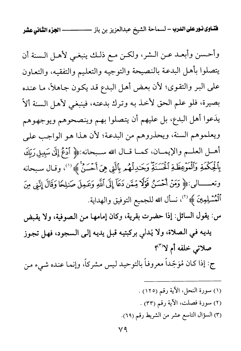 وأحسن وأبعد عن الشر، ولكن مع ذلك ينبغي لأهل السنة أن يتصلوا بأهل البدعة بالنصيحة والتوجيه والتعليم والتفقيه، والتعاون على البر والتقوى؛ لأن بعض أهل البدع قد يكون جاهلا، ما عنده بصيرة، فلو علم الحق لأخذ به وترك بدعته، فينبغي لأهل السنة ألا يدعوا أهل البدع، بل عليهم أن يتصلوا بهم وينصحوهم ويوجهوهم ويعلموهم السنة، ويحذروهم من البدعة؛ لأن هذا هو الواجب على أهل العلم والإيمان، كما قال الله سبحانه: {ادْعُ إِلَى سَبِيلِ رَبِّكَ بِالْحِكْمَةِ وَالْمَوْعِظَةِ الْحَسَنَةِ وَجَادِلْهُمْ بِالَّتِي هِيَ أَحْسَنُ} (¬1)، وقال سبحانه وتعالى: {وَمَنْ أَحْسَنُ قَوْلًا مِمَّنْ دَعَا إِلَى اللَّهِ وَعَمِلَ صَالِحًا وَقَالَ إِنَّنِي مِنَ الْمُسْلِمِينَ} (¬2)، نسأل الله للجميع التوفيق والهداية.