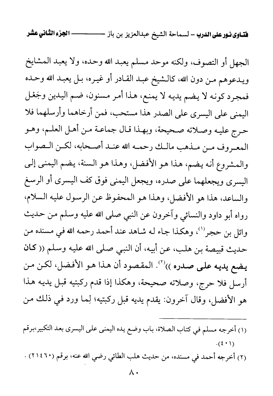 الجهل أو التصوف، ولكنه موحد مسلم يعبد الله وحده، ولا يعبد المشايخ ويدعوهم من دون الله، كالشيخ عبد القادر أو غيره، بل يعبد الله وحده فمجرد كونه لا يضم يديه لا يمنع، هذا أمر مسنون، ضم اليدين وجعل اليمنى على اليسرى على الصدر هذا مستحب، فمن أرخاهما وأرسلهما فلا حرج عليه وصلاته صحيحة، وبهذا قال جماعة من أهل العلم، وهو المعروف من مذهب مالك رحمه الله عند أصحابه، لكن الصواب والمشروع أنه يضم، هذا هو الأفضل، وهذا هو السنة، يضم اليمنى إلى اليسرى ويجعلهما على صدره، ويجعل اليمنى فوق كف اليسرى أو الرسغ والساعد، هذا هو الأفضل، وهذا هو المحفوظ عن الرسول عليه السلام، رواه أبو داود والنسائي وآخرون عن النبي صلى الله عليه وسلم من حديث وائل بن حجر (¬1) وهكذا جاء له شاهد عند أحمد رحمه الله في مسنده من حديث قبيصة بن هلب، عن أبيه، أن النبي صلى الله عليه وسلم «كان يضع يديه على صدره (¬2)» المقصود أن هذا هو الأفضل، لكن من أرسل فلا حرج، وصلاته صحيحة، وهكذا إذا قدم ركبتيه قبل يديه هذا هو الأفضل، وقال آخرون: يقدم يديه قبل ركبتيه؛ لما ورد في ذلك من
