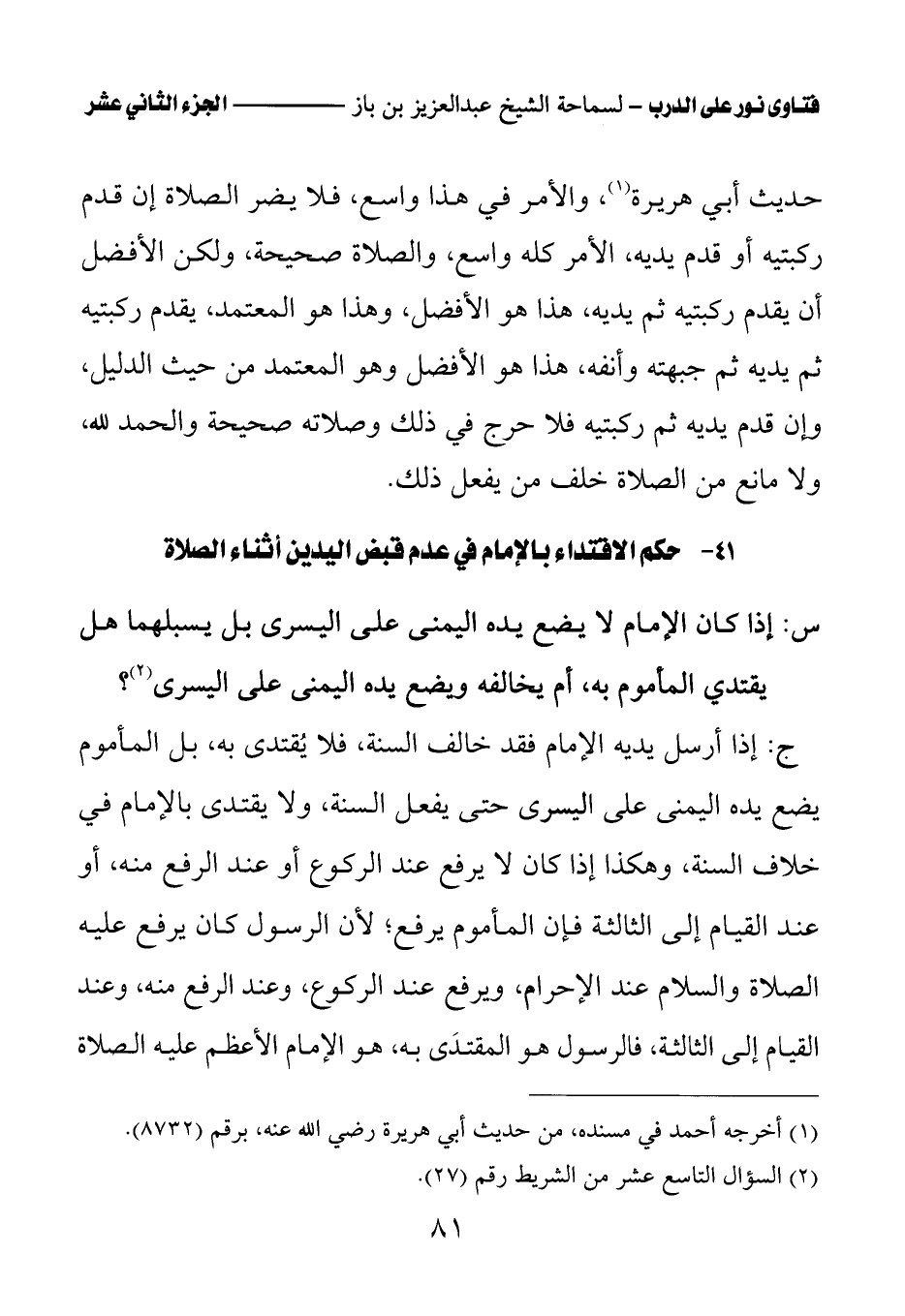حديث أبي هريرة (¬1) والأمر في هذا واسع، فلا يضر الصلاة إن قدم ركبتيه أو قدم يديه، الأمر كله واسع، والصلاة صحيحة، ولكن الأفضل أن يقدم ركبتيه ثم يديه، هذا هو الأفضل، وهذا هو المعتمد، يقدم ركبتيه ثم يديه ثم جبهته وأنفه، هذا هو الأفضل وهو المعتمد من حيث الدليل، وإن قدم يديه ثم ركبتيه فلا حرج في ذلك وصلاته صحيحة والحمد لله، ولا مانع من الصلاة خلف من يفعل ذلك.
