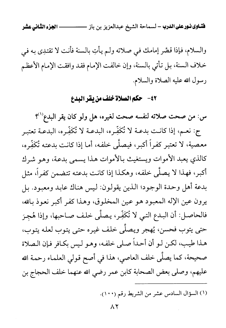 س: من صحت صلاته لنفسه صحت لغيره، هل ولو كان يقر البدع (¬1)؟