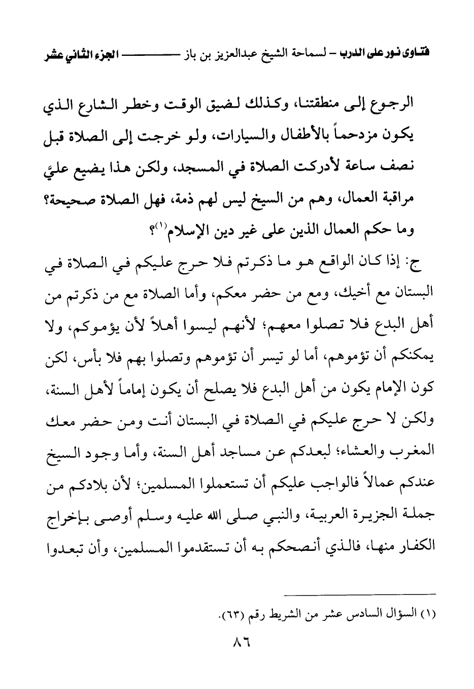 ج: إذا كان الواقع هو ما ذكرتم فلا حرج عليكم في الصلاة في البستان مع أخيك، ومع من حضر معكم، وأما الصلاة مع من ذكرتم من أهل البدع فلا تصلوا معهم؛ لأنهم ليسوا أهلا لأن يؤموكم، ولا يمكنكم أن تؤموهم، أما لو تيسر أن تؤموهم وتصلوا بهم فلا بأس، لكن كون الإمام يكون من أهل البدع فلا يصلح أن يكون إماما لأهل السنة، ولكن لا حرج عليكم في الصلاة في البستان أنت ومن حضر معك المغرب والعشاء؛ لبعدكم عن مساجد أهل السنة، وأما وجود السيخ عندكم عمالا فالواجب عليكم أن تستعملوا المسلمين؛ لأن بلادكم من جملة الجزيرة العربية، والنبي صلى الله عليه وسلم أوصى بإخراج الكفار منها، فالذي أنصحكم به أن تستقدموا المسلمين، وأن تبعدوا