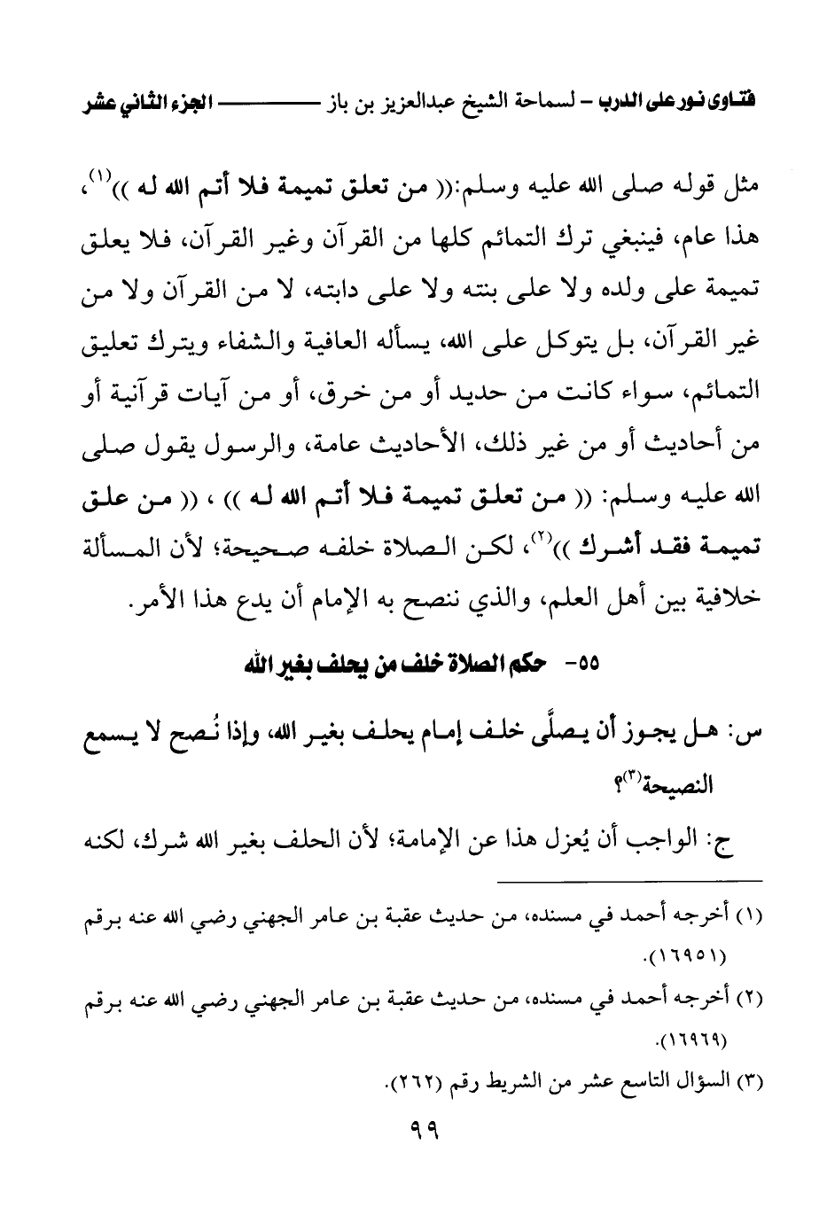 مثل قوله صلى الله عليه وسلم: «من تعلق تميمة فلا أتم الله له (¬1)» هذا عام، فينبغي ترك التمائم كلها من القرآن وغير القرآن، فلا يعلق تميمة على ولده ولا على بنته ولا على دابته، لا من القرآن ولا من غير القرآن، بل يتوكل على الله، يسأله العافية والشفاء ويترك تعليق التمائم، سواء كانت من حديد أو من خرق، أو من آيات قرآنية أو من أحاديث أو من غير ذلك، الأحاديث عامة، والرسول يقول صلى الله عليه وسلم: «من تعلق تميمة فلا أتم الله له (¬2)»، «من علق تميمة فقد أشرك (¬3)» لكن الصلاة خلفه صحيحة؛ لأن المسألة خلافية بين أهل العلم، والذي ننصح به الإمام أن يدع هذا الأمر.