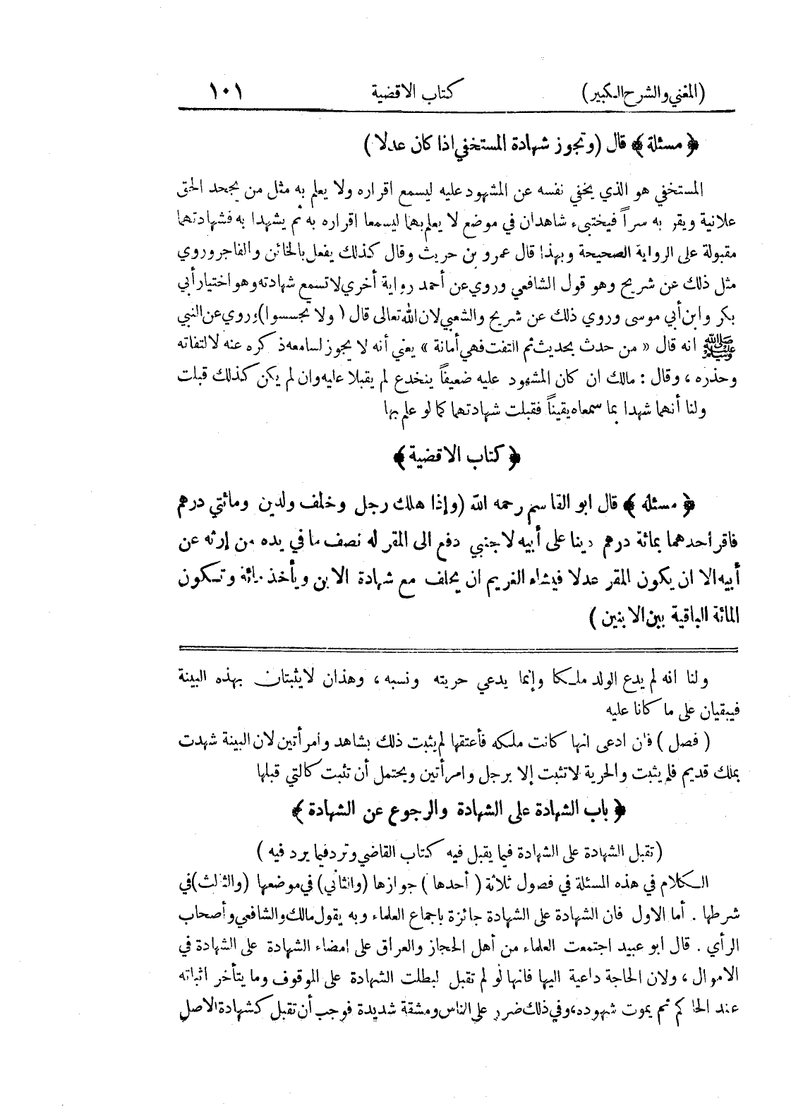 ولنا أنه لم يدع الولد ملكا وإنما يدعي حريته ونسبه، وهذان لا يثبتان بهذه البينة فيبقيان على ما كانا عليه (فصل) فإن ادعى أنها كانت ملكه فأعتقها لم يثبت ذلك بشاهد وامرأتين لأن البينة شهدت بملك قديم فلم يثبت والحرية لا تثبت إلا برجل وامرأتين ويحتمل أن تثبت كالتي قبلها (باب الشهادة على الشهادة والرجوع عن الشهادة) (تقبل الشهادة على الشهادة فيما يقبل فيه كتاب القاضي وترد فيما يرد فيه) الكلام في هذه المسألة في فصول ثلاثة (أحدها) جوازها (والثاني) في موضعها (والثالث) في شرطها.