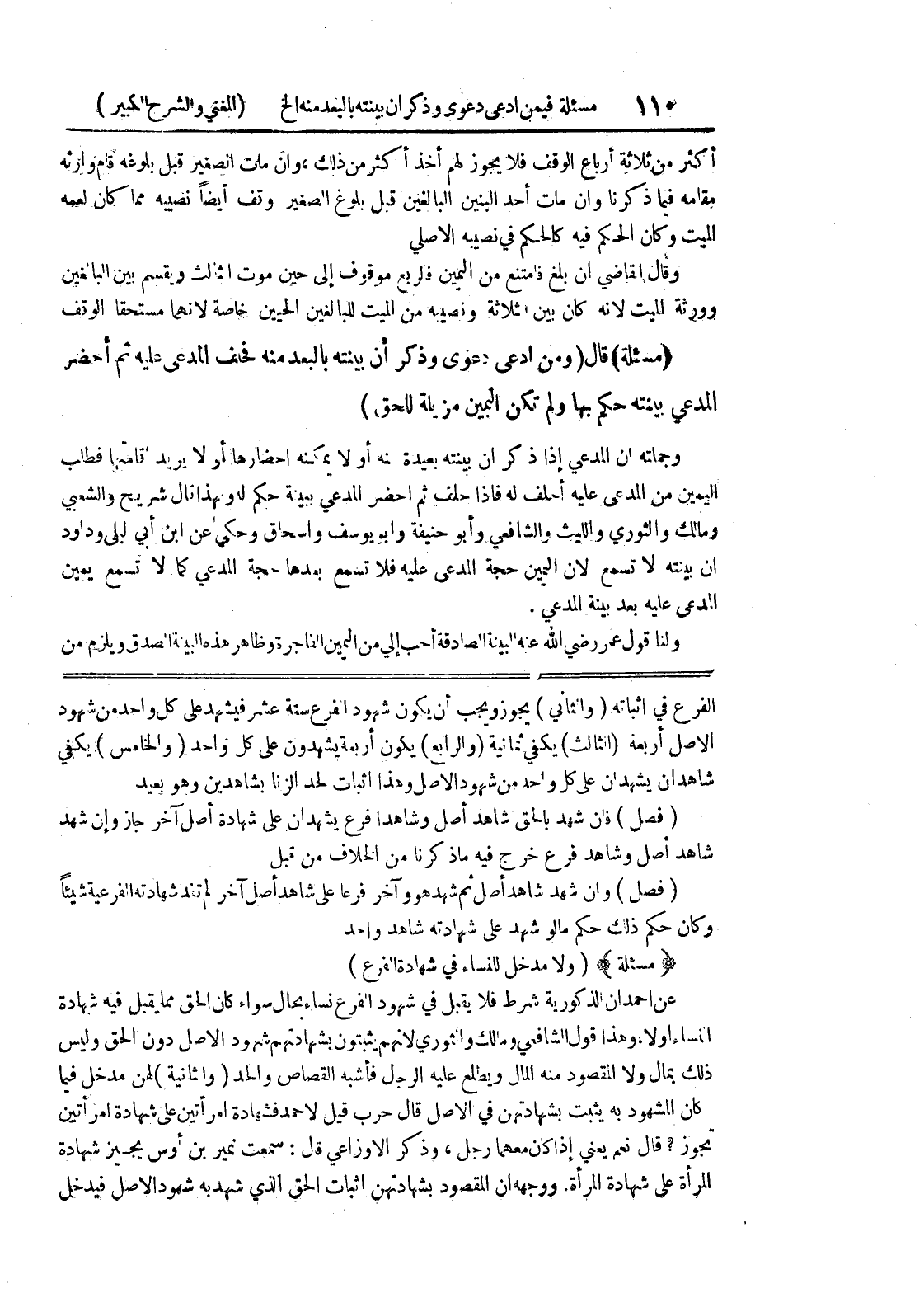 الفرع في إثباته (والثاني) يجوز ويجب أن يكون شهود الفرع ستة عشر فيشهد على كل واحد من شهود الأصل أربعة (الثالث) يكفي ثمانية (والرابع) يكون أربعة يشهدون على كل واحد (والخامس) يكفي شاهدان يشهدان على كل واحد من شهود الأصل وهذا إثبات لحد الزنا بشاهدين وهو بعيد (فصل) فإن شهد بالحق شاهد أصل وشاهدا فرع يشهدان على شهادة أصل آخر جاز وإن شهد شاهد أصل وشاهد فرع خرج فيه ما ذكرنا من الخلاف من قبل (فصل) وإن شهد شاهد أصل ثم شهد هو وآخر فرعاً على شاهد أصل آخر لم تفد شهادته الفرعية شيئاً وكان حكم ذلك حكم ما لو شهد على شهادته شاهد واحد (مسألة) (ولا مدخل للنساء في شهادة الفرع) عن احمدان الذكورية شرط فلا يقبل في شهود الفرع نساء بحال سواء كان الحق مما يقبل فيه شهادة النساء اولا.