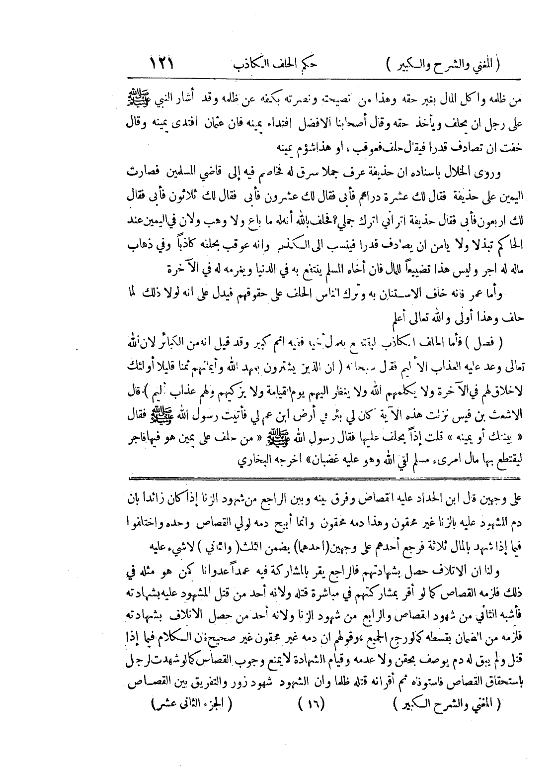 على وجهين قال ابن الحداد عليه القصاص وفرق بينه وبين الراجع من شهود الزنا إذا كان زائداً بأن دم المشهود عليه بالزنا غير محقون وهذا دمه محقون وإنما أبيح دمه لولي القصاص وحده واختلفوا فيما إذا شهد بالمال ثلاثة فرجع أحدهم على وجهين (أحدهما) يضمن الثلث (والثاني) لا شئ عليه ولنا أن الإتلاف حصل بشهادتهم فالراجع يقر بالمشاركة فيه عمداً عدواناً كمن هو مثله في ذلك فلزمه القصاص كما لو أقر بمشاركتهم في مباشرة قتله ولأنه أحد من قتل المشهود عليه بشهادته فأشبه الثاني من شهود القصاص والرابع من شهود الزنا ولأنه أحد من حصل الإتلاف بشهادته فلزمه من الضمان بقسطه كما لو رجع الجميع، وقولهم أن دمه غير محقون غير صحيح فإن الكلام فيما إذا قتل ولم يبق له دم يوصف بحقن ولا عدمه وقيام الشهادة لا يمنع وجوب القصاص كما لو شهدت لرجل باستحقاق القصاص فاستوفاه ثم أقرانه قتله ظلماً وأن الشهود شهود زور والتفريق بين القصاص