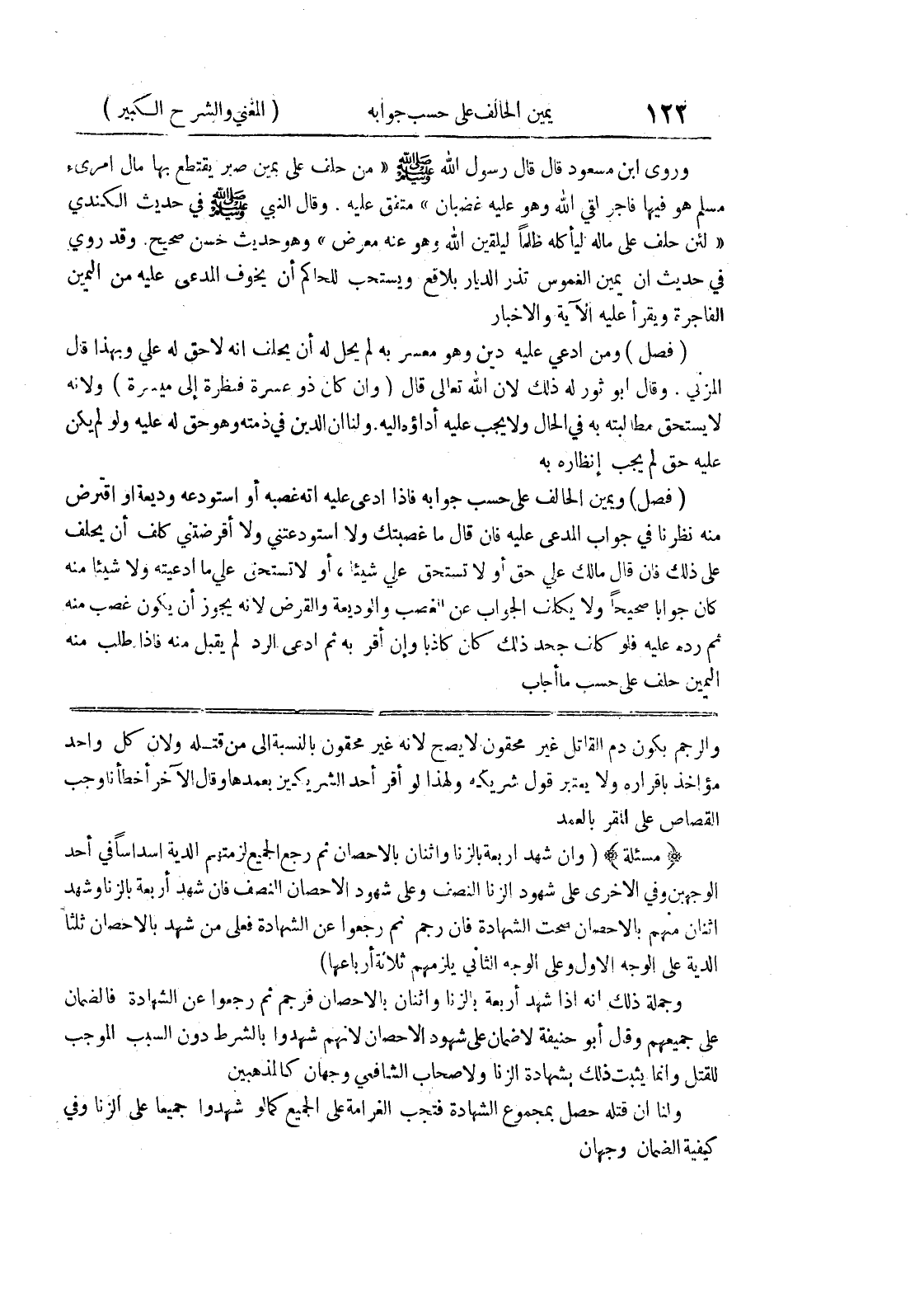 والرجم يكون دم القاتل غير محقون لا يصح لأنه غير محقون بالنسبة إلى من قتله ولأن كل واحد مؤاخذ بإقراره ولا يعتبر قول شريكه ول هذا لو أقر أحد الشريكين بعمدها وقال الآخر أخطأنا وجب القصاص على المقر بالعمد (مسألة) (وإن شهد أربعة بالزنا وإثنان بالإحصان ثم رجع الجميع لزمتهم الدية أسداساً في أحد الوجهين وفي الأخرى على شهود الزنا النصف وعلى شهود الإحصان النصف فإن شهد أربعة بالزنا وشهد اثنان منهم بالإحصان صحت الشهادة فإن رجم ثم رجعوا عن الشهادة فعلى من شهد بالإحصان ثلثا الدية على الوجه الأول وعلى الوجه الثاني يلزمهم ثلاثة أرباعها)