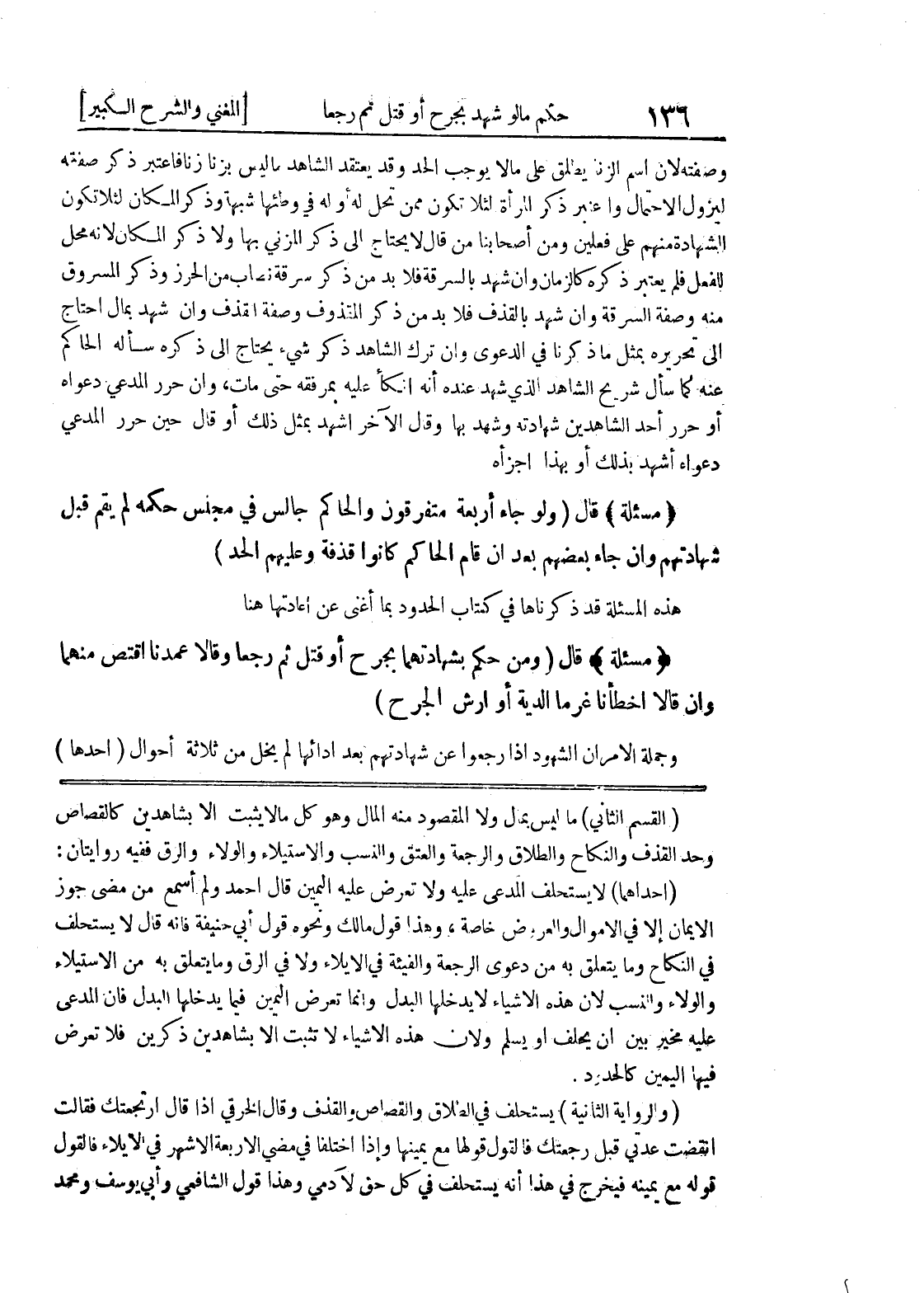 (القسم الثاني) ما ليس بمال ولا المقصود منه المال وهو كل ما لا يثبت إلا بشاهدين كالقصاص وحد القذف والنكاح والطلاق والرجعة والعتق والنسب والاستيلاء والولاء والرق ففيه روايتان: (إحداهما) لا يستحلف المدعى عليه ولا تعرض عليه اليمين قال أحمد ولم أسمع من مضى جوز الأيمان إلا في الأموال والعروض خاصة، وهذا قول مالك ونحوه قول أبي حنيفة فإنه قال لا يستحلف في النكاح وما يتعلق به من دعوى الرجعة والفيئة في الإيلاء ولا في الرق وما يتعلق به من الاستيلاء والولاء والنسب لأن هذه الأشياء لا يدخلها البدل وإنما تعرض اليمين فيما يدخلها البدل فإن المدعى عليه مخير بين أن يحلف أو يسلم ولأن هذه الأشياء لا تثبت إلا بشاهدين ذكرين فلا تعرض فيها اليمين كالحدود.