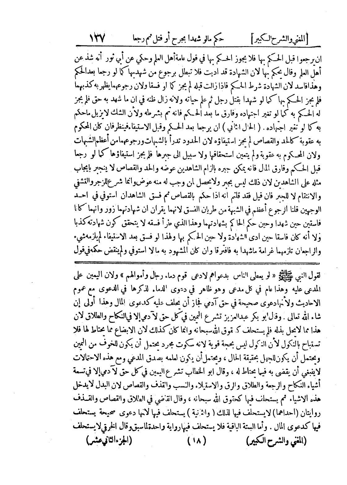 وقال أبو بكر عبد العزيز تشرع اليمين في كل حق لآدمي إلا في النكاح والطلاق لأن هذا مما لا يحل بذله فلم يستحلف كحقوق الله سبحانه وإنما كان كذلك لأن الإبضاع مما يحتاط لها فلا تستباح بالنكول لأن النكول ليس بحجة قوية لانه سكوت مجرد يحتمل أن يكون للخوف من اليمين ويحتمل أن يكون للجهل بحقيقة الحال، ويحتمل أن يكون لعلمه بصدق المدعي ومع هذه الاحتمالات لا نيبغي أن يقضي به فيما يحتاط له، وقال أبو الخطاب تشرع اليمين في كل حق لآدمي إلا في تسعة أشياء النكاح والرجعة والطلاق والرق والاستيلاء والنسب والقذف والقصاص لأن البدل لا يدخل هذه الأشياء ثم يستحلف فيها كحقوق الله سبحانه، وقال القاضي في الطلاق والقصاص والقذف روايتان (إحداهما) لا يستحلف فيها لذلك (والثانية) يستحلف فيها لأنها دعوى صحيحة يستحلف فيها كدعوى المال.