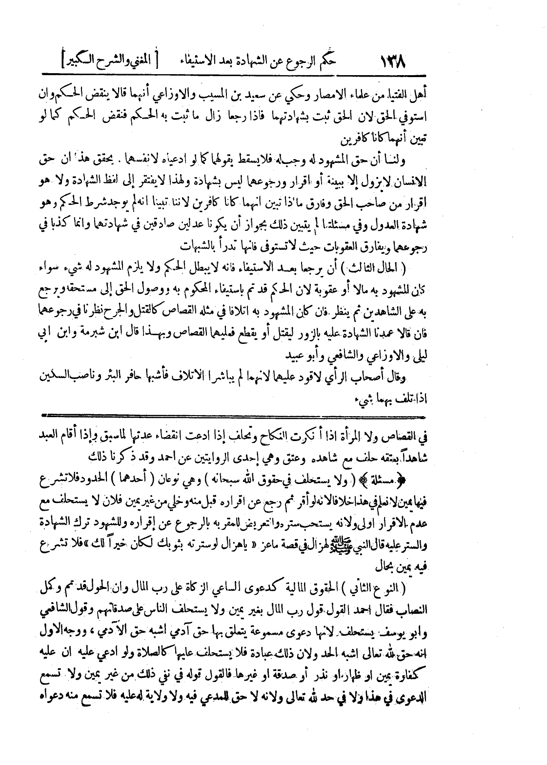 في القصاص ولا المرأة إذا أنكرت النكاح وتحلف إذا ادعت انقضاء عدتها لما سبق وإذا أقام العبد شاهداً بعتقه حلف مع شاهده وعتق وهي إحدى الروايتين عن أحمد وقد ذكرنا ذلك (مسألة) (ولا يستحلف في حقوق الله سبحانه) وهي نوعان (أحدهما) الحدود فلا تشرع فيها يمين لا نعلم في هذا خلافاً لأنه لو أقر ثم رجع عن إقراره قبل منه وخلي من غير يمين فلأن لا يستحلف مع عدم الإقرار أولى ولأنه يستحب ستره والتعريض للمقر به بالرجوع عن إقراره وللشهود ترك الشهادة والستر عليه قال النبي صلى الله عليه وسلم لهزال في قصة ماعز (ياهزال لو سترته بثوبك لكان خيراً لك) فلا تشرع فيه يمين بحال (النوع الثاني) الحقوق المالية كدعوى الساعي الزكاة على رب المال وإن الحول قد تم وكمل النصاب فقال أحمد القول قول رب المال بغير يمين ولا يستحلف الناس على صدقاتهم وقول الشافعي وابو يوسف يستحلف لأنها دعوى مسموعة يتعلق بها حق آدمي أشبه حق الآدمي، ووجه الأول أنه حق لله تعالى أشبه الحد ولأن ذلك عبادة فلا يستحلف عليها كالصلاة ولو ادعى عليه أن عليه كفارة يمين أو ظهار أو نذر أو صدقة أو غيرها فالقول قوله في نفي ذلك من غير يمين ولا تسمع