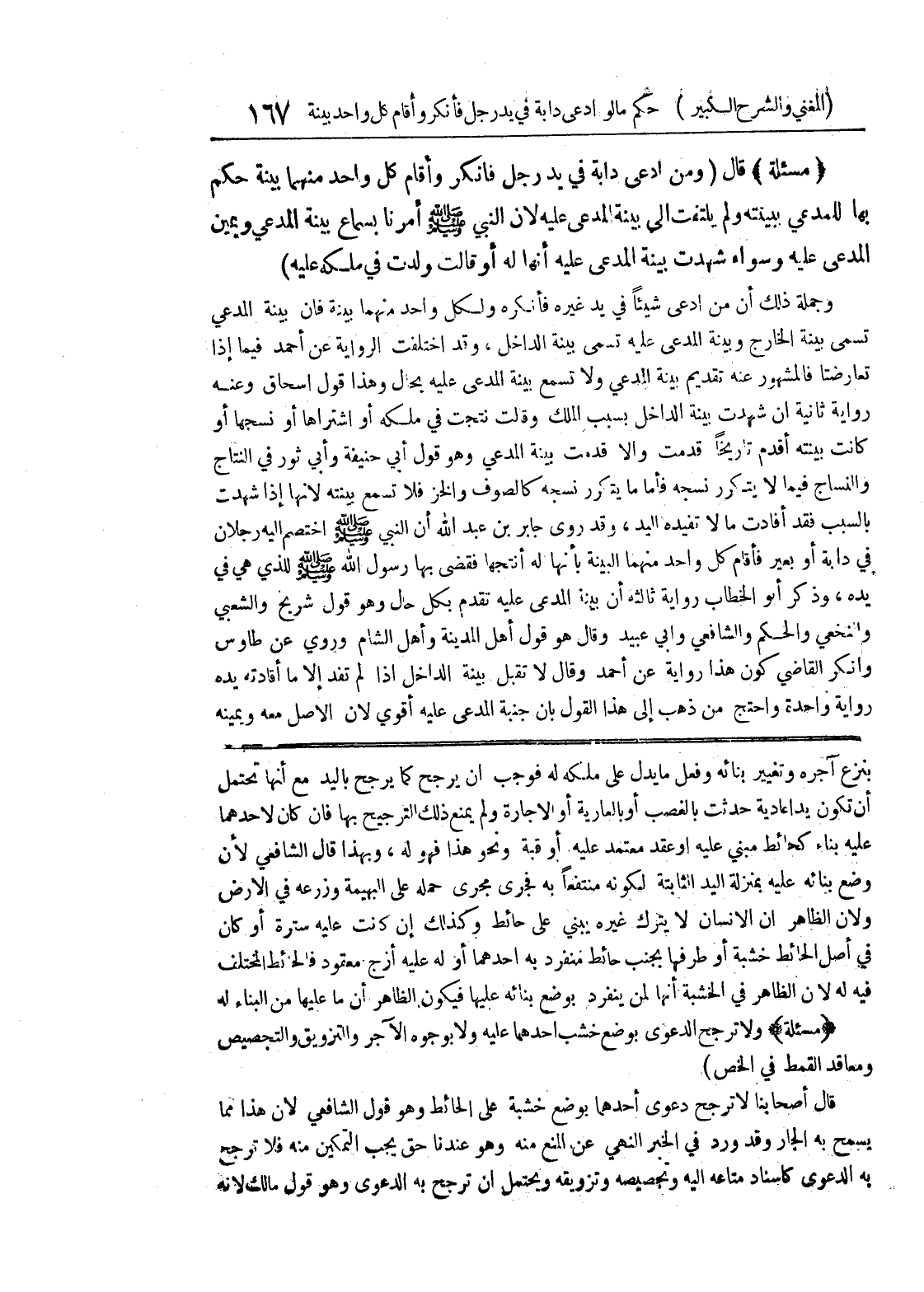 بنزع آجره وتغيير بنائه وفعل ما يدل على ملكه له فوجب أن يرجح كما يرجح باليد مع أنها تحتمل أن تكون يداً عادية حدثت بالغصب أو بالعارية أو الإجارة ولم يمنع ذلك الترجيح بها فإن كان لأحدهما عليه بناء كحائط مبني عليه أو عقد معتمد عليه أو قبة ونحو هذا فهو له، وبهذا قال الشافعي لأن وضع بنائه عليه بمنزلة اليد الثابتة لكونه منتفعاً به فجرى مجرى حمله على البهيمة وزرعه في الأرض ولأن الظاهر أن الإنسان لا يترك غيره يبني على حائط وكذلك إن كانت عليه سترة أو كان في أصل الحائط خشبة أو طرفها بجنب حائط منفرد به أحدهما أو له عليه أزج معقود فالحائط المختلف فيه له لأن الظاهر في الخشبة أنها لمن ينفرد بوضع بنائه عليها فيكون الظاهر أن ما عليها من البناء له (مسألة) ولا ترجح الدعوى بوضع خشب أحدهما عليه ولا بوجوه الآجر والتزويق والتجصيص ومعاقد القمط في الخمص) قال أصحابنا لا ترجح دعوى أحدهما بوضع خشبة على الحائط وهو قول الشافعي لأن هذا مما يسمح به الجار وقد ورد في الخبر النهي عن المنع منه وهو عندنا حق يجب التمكين منه فلا ترجح به الدعوى كإسناد متاعه إليه وتجصيصه وتزويقه ويحتمل أن ترجح به الدعوى وهو قول مالك لأنه