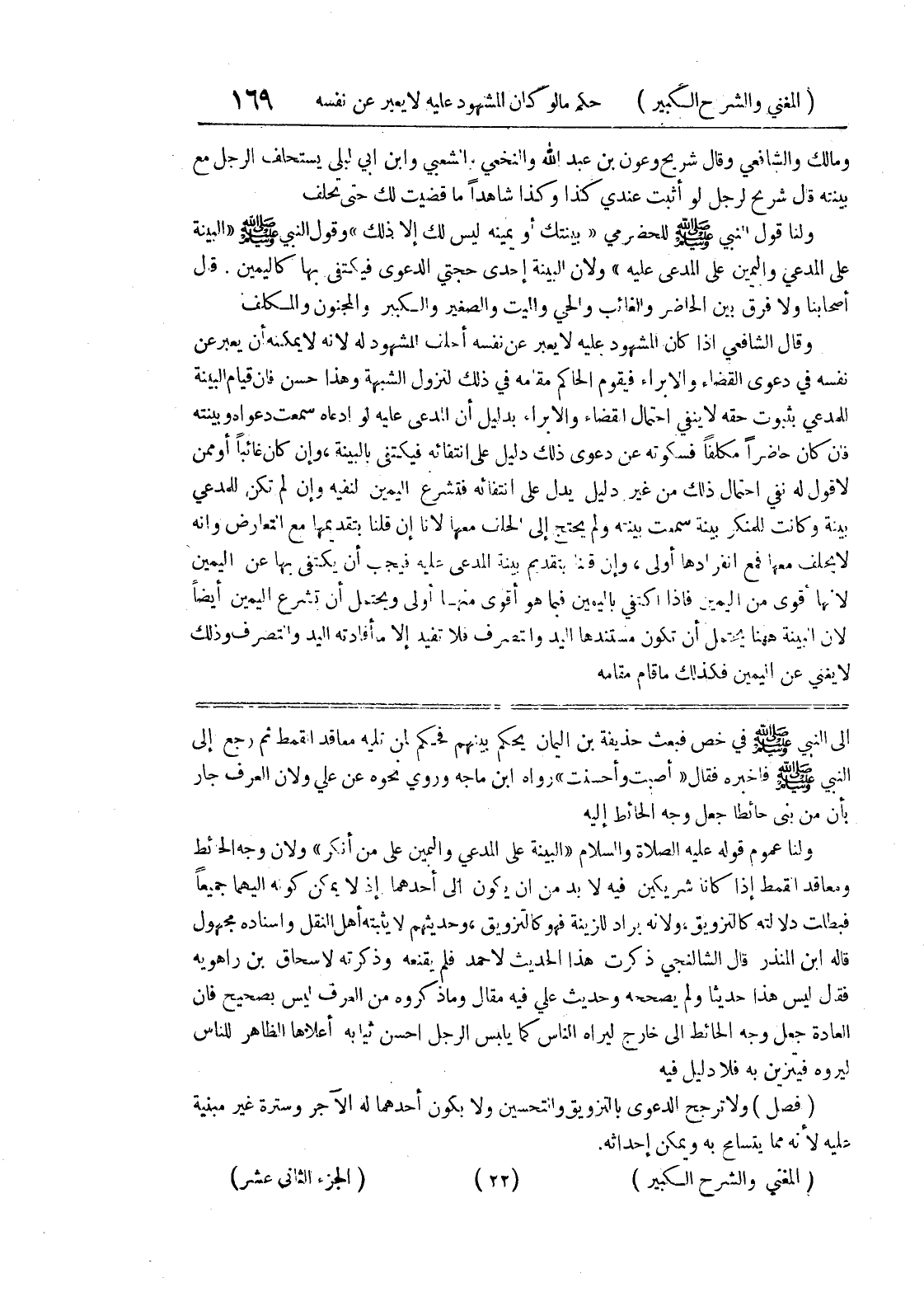 إلى النبي صلى الله عليه وسلم في خص فبعث حذيفة بن اليمان يحكم بينهم فحكم لمن تليه معاقد القمط ثم رجع إلى النبي صلى الله عليه وسلم فأخبره فقال (أصبت وأحسنت) رواه ابن ماجة وروي نحوه عن علي ولأن العرف جار بأن من بنى حائطاً جعل وجه الحائط إليه ولنا عموم قوله عليه الصلاة والسلام (البينة على المدعي واليمين على من أنكر) ولأن وجه الحائط ومعاقد القمط إذا كانا شريكين فيه لا بد من أن يكون إلى أحدهما إذ لا يمكن كونه إليهما جميعاً فبطلت دلالته كالتزويق، ولأنه براد للزينة فهو كالتزويق، وحديثهم لا يثبته أهل النقل وإسناده مجهول قاله ابن المنذر قال الشالنجي ذكرت هذا الحديث لأحمد فلم يقنعه وذكرته لإسحاق بن راهويه فقال ليس هذا حديثاً ولم يصححه وحديث علي فيه مقال وما ذكروه من العرف ليس بصحيح فإن العادة جعل وجه الحائط إلى خارج ليراه الناس كما يلبس الرجل أحسن ثيابه أعلاها الظاهر للناس ليروه فيتزين به فلا دليل فيه (فصل) ولا ترجح الدعوى بالتزويق والتحسين ولا بكون أحدهما له الآجر وسترة غير مبنية عليه لأنه مما يتسامح به ويمكن إحداثه.