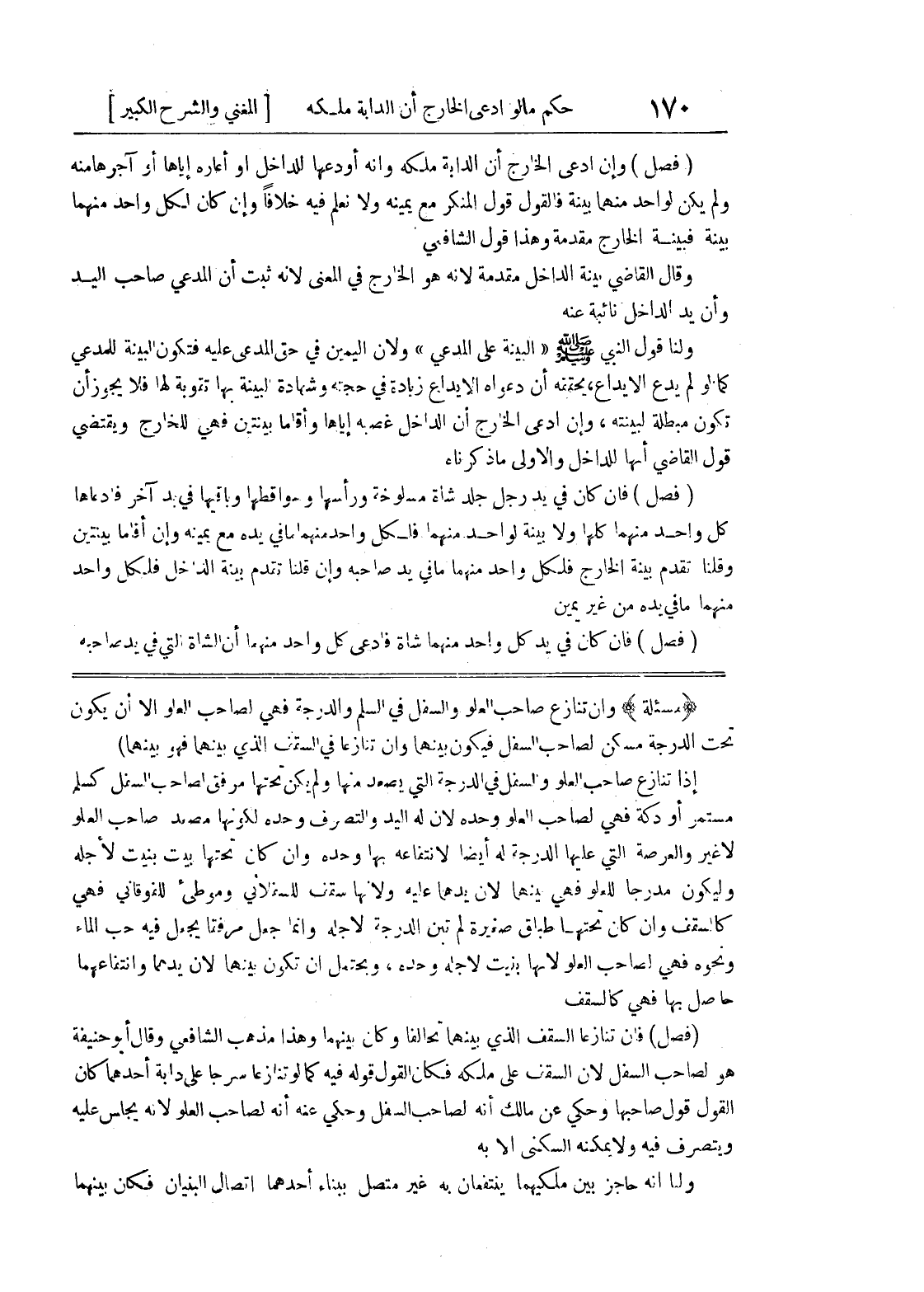 إذا تنازع صاحب العلو والسفل في الدرجة التي يصعد منها ولم يكن تحتها مرفق لصاحب السفل كسلم مستمر أو دكة فهي لصاحب العلو وحده لأن له اليد والتصرف وحده لكونها مصعد صاحب العلو لا غير والعرصة التي عليها الدرجة له أيضاً لانتفاعه بها وحده وإن كان تحتها بيت بنيت لأجله وليكون مدرجاً للعلو فهي بينهما لأن يدهما عليه ولأنها سقف للسفلاني وموطئ للفوقاني فهي كالسقف وإن كان تحتها طباق صغيرة لم تبن الدرجة لأجله وإنما جعل مرفقاً يجعل فيه حب الماء ونحوه فهي لصاحب العلو لأنها بنيت لأجله وحده، ويحتمل أن تكون بينهما لأن يدهما وانتفاعهما حاصل بها فهي كالسقف (فصل) فإن تنازعا السقف الذي بينهما تحالفا وكان بينهما وهذا مذهب الشافعي وقال أبو حنيفة هو لصاحب السفل لأن السقف على ملكه فكان القول قوله فيه كما لو تنازعا سرجاً على دابة أحدهما كان القول قول صاحبها وحكي عن مالك أنه لصاحب السفل وحكي عنه أنه لصاحب العلو لأنه يجلس عليه ويتصرف فيه ولا يمكنه السكنى إلا به ولنا أنه حاجز بين ملكيهما ينتفعان به غير متصل ببناء أحدهما اتصال البنيان فكان بينهما