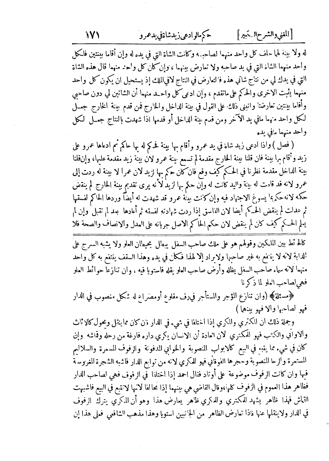 المستمرة والرحا المنصوبة وحجرها الفوقاني فهو للمكري لأنه من توابع الدار فأشبه الشجرة المغروسة فيها وإن كانت الرفوف موضوعة على أوتاد فقال أحمد إذا اختلفا في الرفوف فهي لصاحب الدار فظاهر هذا العموم في الزفوف كلها، وقال القاضي هي بينهما إذا تحالفا لأنها لا تتبع في البيع فأشبهت القماش فهذا ظاهر يشهد للمكتري وللمكري ظاهر يعارض هذا وهو أن المكري يترك الرفوف في الدار ولا ينقلها عنها فإذا تعارض الظاهر من الجانبين استويا وهذا مذهب الشافعي فعلى هذا إن