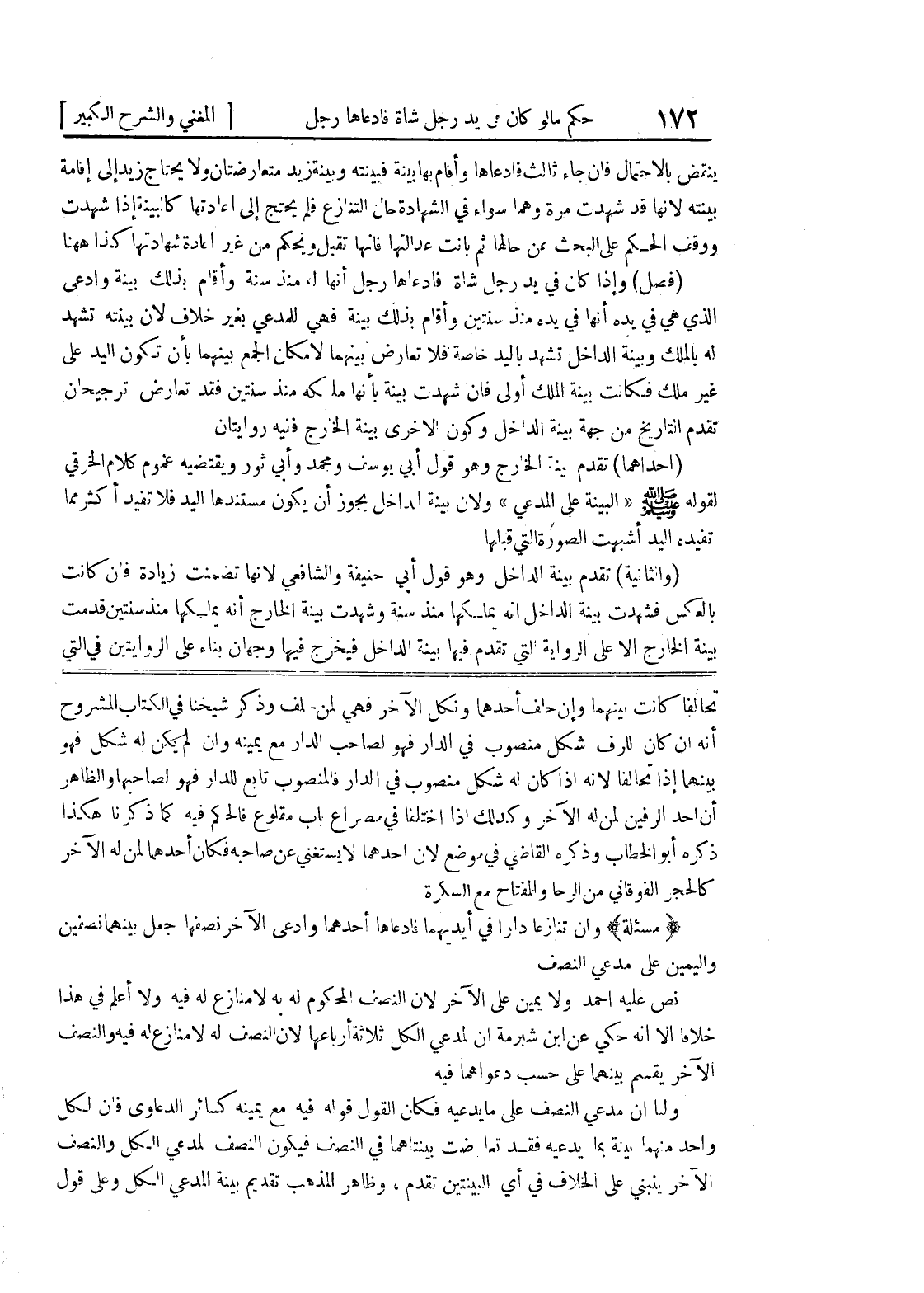 تحالفا كانت بينهما وإن حلف أحدهما ونكل الآخر فهي لمن حلف وذكر شيخنا في الكتاب المشروح أنه إن كان للرف شكل منصوب في الدار فهو لصاحب الدار مع يمينه وإن لم يكن له شكل فهو بينهما إذا تحالفا لأنه إذا كان له شكل منصوب في الدار فالمنصوب تابع للدار فهو لصاحبها والظاهر أن أحد الرفين لمن له الآخر وكذلك إذا اختلفا في مصراع باب مقلوع فالحكم فيه كما ذكرنا هكذا ذكره أبو الخطاب وذكره القاضي في موضع لأن أحدهما لا يستغني عن صاحبه فكان أحدهما لمن له الآخر كالحجر الفوقاني من الرحا والمفتاح مع السكرة (مسألة) وإن تنازعا داراً في أيديهما فادعاها أحدهما وادعى الآخر نصفها جعل بينهما نصفين واليمين على مدعي النصف نص عليه أحمد ولا يمين على الآخر لأن النصف المحكوم له به لا منازع له فيه ولا أعلم في هذا خلافاً إلا أنه حكي عن ابن شبرمة أن لمدعي الكل ثلاثة أرباعها لأن النصف له لا منازع له فيه والنصف الآخر يقسم بينهما على حسب دعواهما فيه ولنا أن مدعي النصف على ما يدعيه فكان القول قوله فيه مع يمينه كسائر الدعاوي فإن لكل واحد منهما بينة بما يدعيه فقد تعارضت بينتاهما في النصف فيكون النصف لمدعي الكل والنصف الآخر ينبني على الخلاف في أي البينتين تقدم، وظاهر المذهب تقديم بينة المدعي الكل وعلى قول