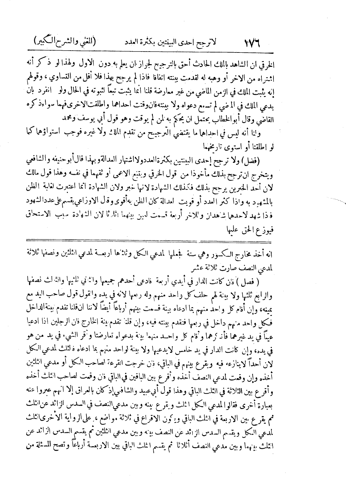 أنه أخذ مخارج الكسور وهي ستة فجعلها لمدعي الكل وثلثاها أربعة لمدعي الثلثين ونصفها ثلاثة لمدعي النصف صارت ثلاثة عشر (فصل) فإن كانت الدار في أيدي أربعة فادعى أحدهم جميعها والثاني ثلثيها والثالث نصفها والرابع ثلثها ولا بينة لهم حلف كل واحد منهم وله ربعها لأنه في يده والقول قول صاحب اليد مع يمينه، وإن أقام كل واحد منهم بما ادعاه بينة قسمت بينهم أرباعا أيضاً لأننا إن قلنا تقدم بينة الداخل فكل واحد منهم داخل في ربعها فتقدم بينته فيه، وإن قلنا تقدم بينة الخارج فإن الرجلين إذا ادعيا عينا في يد غيرهما فأنكرهما وأقام كل واحد منهما بينة بدعواه تعارضتا وأقر الشئ في يد من هو في يده، وإن كانت الدار في يد خامس لا يدعيها ولا بينة لواحد منهم بما ادعاه فالثلث لمدعي الكل لأن أحداً لا ينازعه فيه ويقرع بينهم في الباقي، فإن خرجت القرعة لصاحب الكل أو مدعي الثلثين أخذه وإن وقعت لمدعي النصف أخذه وأقرع بين الباقين في الباقي فإن وقعت لصاحب الثلث أخذه وأقرع بين الثلاثة في الثلث الباقي وهذا قول أبي عبيد والشافعي إذ كان بالعراق إلا أنهم عبروا عنه بعبارة أخرى فقالوا لمدعي الكل الثلث ويقرع بينه وبين مدعي النصف في السدس الزائد عن الثلث ثم يقرع بين الأربعة في الثلث الباقي ويكون الاقرار في ثلاثة مواضع، على الرواية الأخرى الثلث لمدعي الكل ويقسم السدس الزائد عن النصف بينه وبين مدعي الثلثين ثم يقسم السدس الزائد عن الثلث بينهما وبين مدعي النصف أثلاثاً ثم يقسم الثلث الباقي بين الأربعة أرباعاً وتصح المسألة من