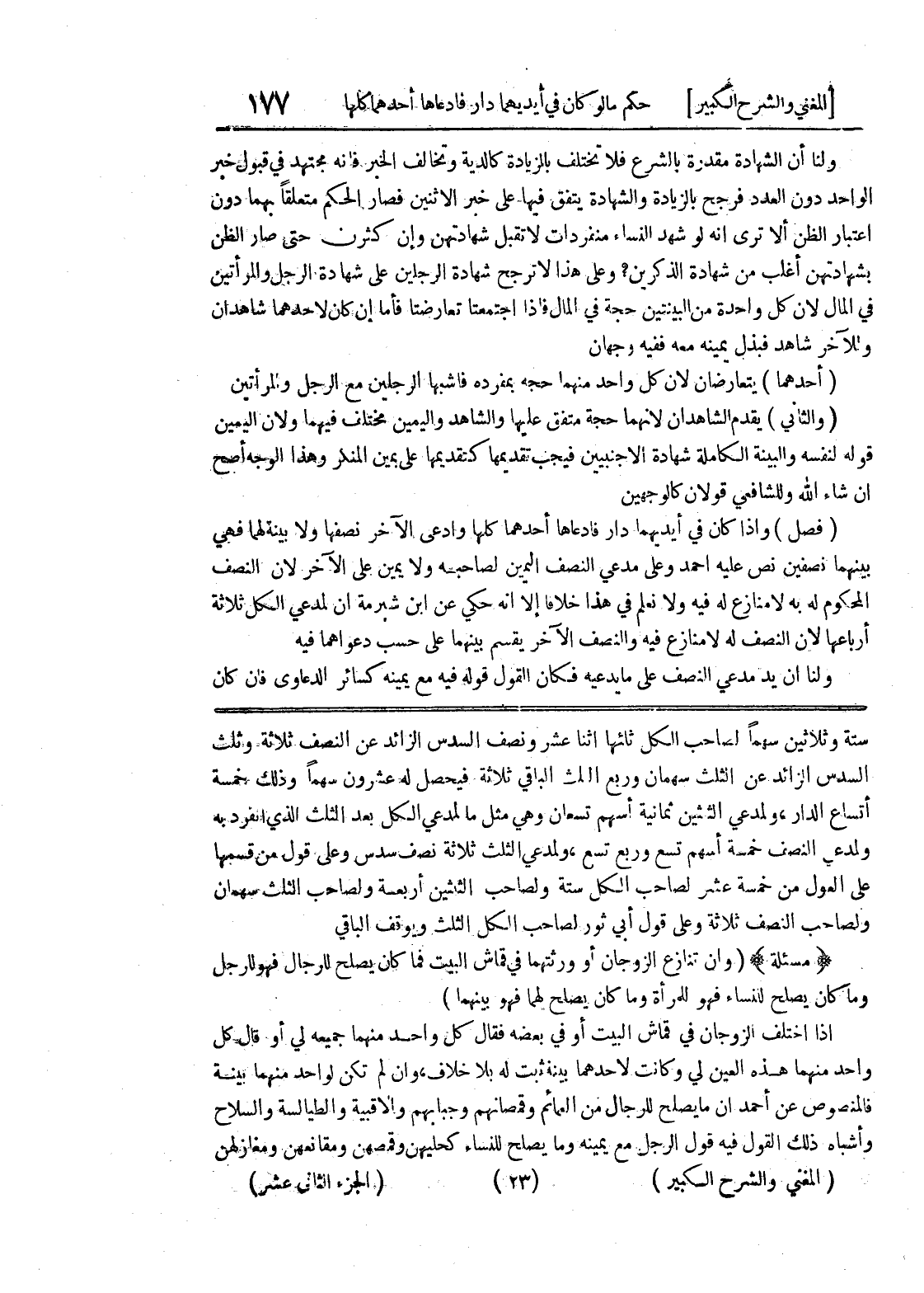 ستة وثلاثين سهماً لصاحب الكل ثلئها اثنا عشر ونصف السدس الزائد عن النصف ثلاثة وثلث السدس الزائد عن الثلث سهمان وربع الثلث الباقي ثلاثة فيحصل له عشرون سهماً وذلك خمسة أتساع الدار، ولمدعي الثلثين ثمانية أسهم تسعان وهي مثل ما لمدعي الكل بعد الثلث الذي انفرد به ولمدعي النصف خمسة أسهم تسع وربع تسع، ولمدعي الثلث ثلاثة نصف سدس وعلى قول من قسمها على العول من خمسة عشر لصاحب الكل ستة ولصاحب الثلثين أربعة ولصاحب الثلث سهمان ولصاحب النصف ثلاثة وعلى قول أبي ثور لصاحب الكل الثلث ويوقف الباقي