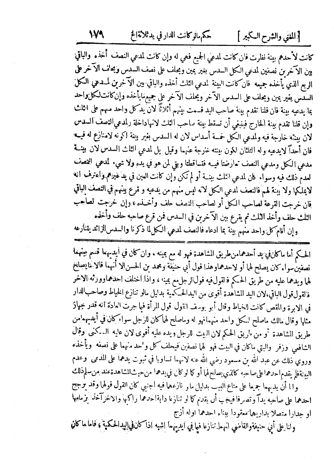 الحكم أما ما كان في يد أحدهما من طريق المشاهدة فهو له مع يمينه، وإن كان في أيديهما قسم بينهما نصفين سواء كان يصلح لهما أو لأحدهما وهذا قول أبي حنيفة ومحمد بن الحسن إلا أنهما قالا ما يصلح لهما ويدهما عليه من طريق الحكم فالقول فيه قول الرجل مع يمينه، وإذا اختلف أحدهما وورثة الآخر فالقول قول الباقي، لان اليد المشاهدة أقوى من اليد الحكمية بدليل ما لو تنازع الخياط وصاحب الدار في الإبرة والمقص كانت للخياط وقال أبو يوسف القول قول المرأة فيما جرت العادة أنه قدر جهاز مثلها وقال مالك ما صلح لكل واحد منهما فهو له وما صلح لهما كان للرجل سواء كان في أيديهما من طريق المشاهدة أو من طريق الحكم لأن البيت للرجل ويده عليه أقوى لأن عليه السكنى وقال الشافعي وزفر والبتي ما كان في البيت فهو لهما نصفين فيحلف كما واحد منهما على نصفه ويأخذه وروي ذلك عن عبد الله بن مسعود رضي الله عنه لأنهما تساويا في ثبوت يدهما على المدعي وعدم البينة فلم يقدم أحدهما على صاحبه كالذي يصلح لهما أو كما لو كان في يدهما من حيث المشاهدة عند من سلم ذلك ولنا أن يديهما جميعاً على متاع البيت بدليل ما لو نازعهما فيه أجنبي كان القول قولهما وقد يرجح أحدهما على صاحبه يداً وتصرفاً فيجب أن يقدم كما لو تنازعا دابة أحدهما راكبها والآخر آخذ بزمامها أو جداراً متصلاً بداريهما معقوداً ببناء أحدهما أوله أزج ولنا على أبي حنيفة والقاضي أنهما تنازعا فيما في أيديهما أشبه إذا كان في اليد الحكمية، فأما ما كان