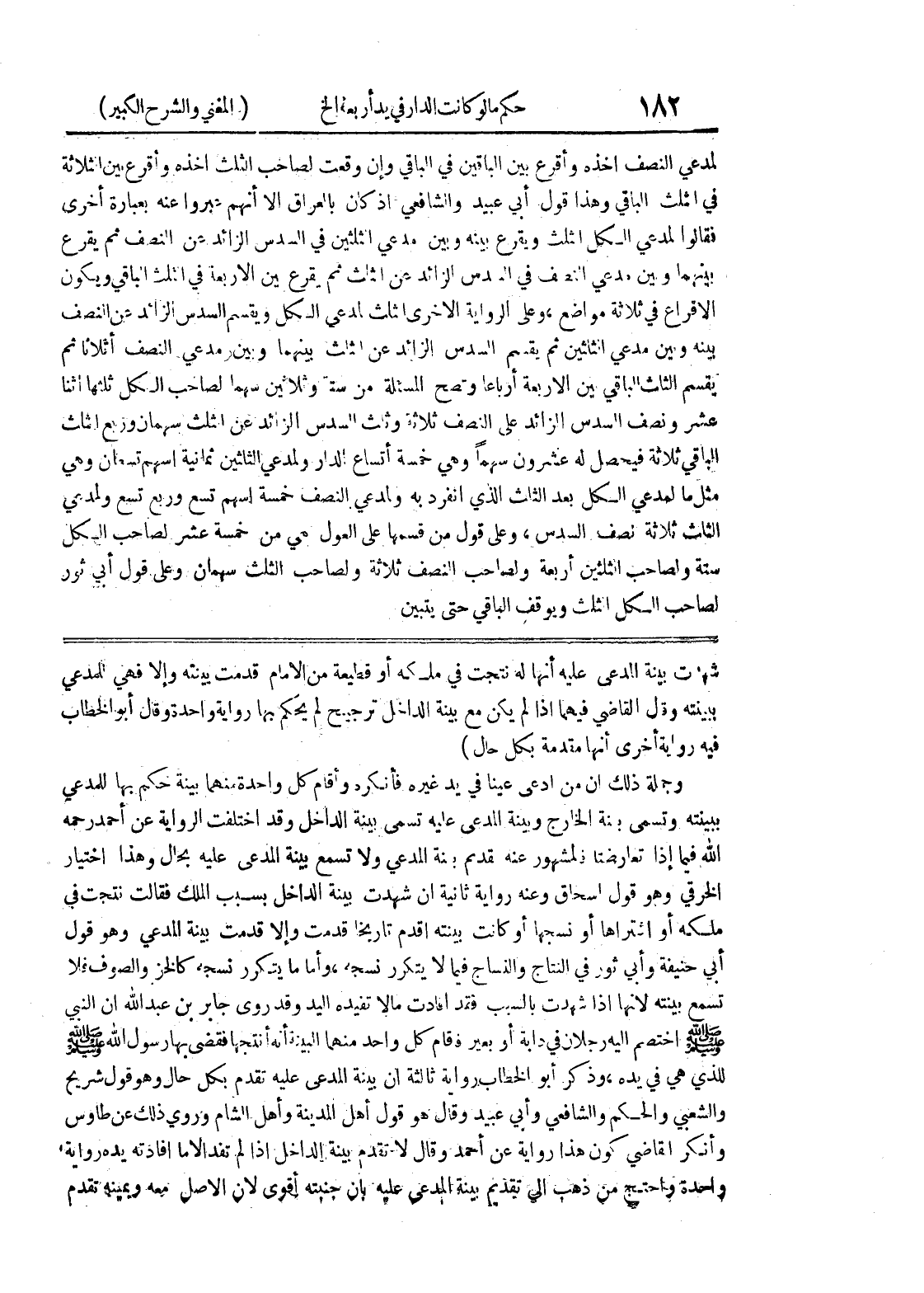 ببينته وقال القاضي فيهما إذا لم يكن مع بينة الداخل ترجيح لم يحكم بها رواية واحدة وقال أبو الخطاب فيه رواية أخرى أنها مقدمة بكل حال) وجملة ذلك أن من ادعى عيناً في يده غير فأنكره وأقام كل واحدة منهما بينة حكم بها للمدعي ببينته وتسمى بينة الخارج وبينة المدعي عليه تسمى بينة الداخل وقد اختلفت الرواية عن أحمد رحمه الله فيما إذا تعارضتا فالمشهور عنه تقديم بينة المدعي ولا تسمع بينة المدعي عليه بحال وهذا اختيار الخرقي وهو قول إسحاق وعنه رواية ثانية إن شهدت بينة الداخل بسبب الملك فقالت نتجت في ملكه أو اشتراها أو نسجها أو كانت بينته أقدم تاريخاً قدمت وإلا قدمت بينة المدعي وهو قول أبي حنيفة وأبي ثور في النتاج والنساج فيما لا يتكرر نسجه، وأما ما يتكرر نسجه كالخز والصوف فلا تسمع بينته لأنها إذا شهدت بالسبب فقد افادت مالا تفيده اليد وقد روى جابر بن عبد الله أن النبي صلى الله عليه وسلم اختصم إليه رجلان في دابة أو بعير فقام كل واحد منهما البينة أنه أنتجها فقضى بها رسول الله صلى الله عليه وسلم للذي هي في يده، وذكر أبو الخطاب رواية ثالثة أن بينة المدعي عليه تقدم بكل حال وهو قول شريح والشعبي والحكم والشافعي وأبي عبيد وقال هو قول أهل المدينة وأهل الشام وروي ذلك عن طاوس وأنكر القاضي كون هذا رواية عن أحمد وقال لا تقدم بينة الداخل إذا لم تفد إلا ما أفادته يده رواية واحدة واحتج من ذهب إلى تقديم بينة المدعي عليه بأن جنبته أقوى لأن الأصل معه ويمينه تقدم