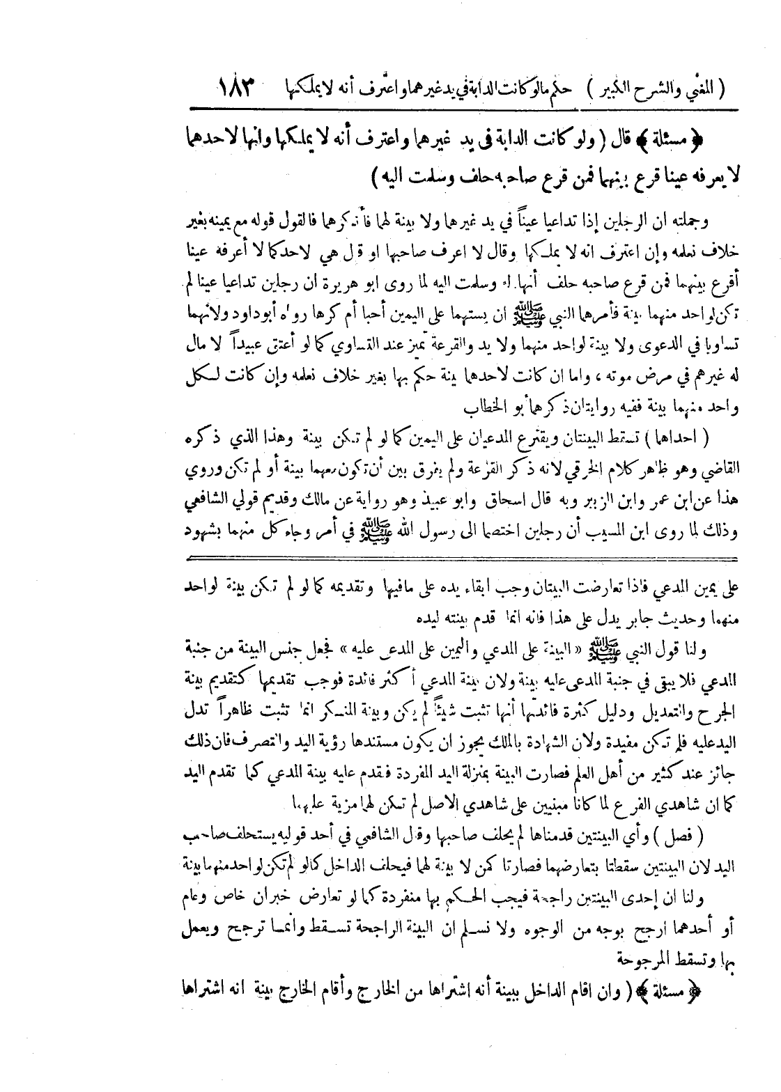 على يمين المدعي فإذا تعارضت البيتان وجب إبقاء يده على ما فيها وتقديمه كما لو لم تكن بينة لواحد منهما وحديث جابر يدل على هذا فإنه إنما قدم بينته ليده ولنا قول النبي صلى الله عليه وسلم (البينة على المدعي واليمين على المدعي عليه) فجعل جنس البينة من جنبة المدعي فلا يبقى في جنبة المدعي عليه بينة ولأن بينة المدعي أكثر فائدة فوجب تقديمها كتقديم بينة الجرح والتعديل ودليل كثرة فائدتها أنها تثبت شيئاً لم يكن وبينة المنكر إنما تثبت ظاهراً تدل اليد عليه فلم تكن مفيدة ولأن الشهادة بالملك يجوز أن يكون مستندها رؤية اليد والتصرف فإن ذلك جائز عند كثير من أهل العلم فصارت البينة بمنزلة اليد المفردة فقدم عليه بينة المدعي كما تقدم اليد