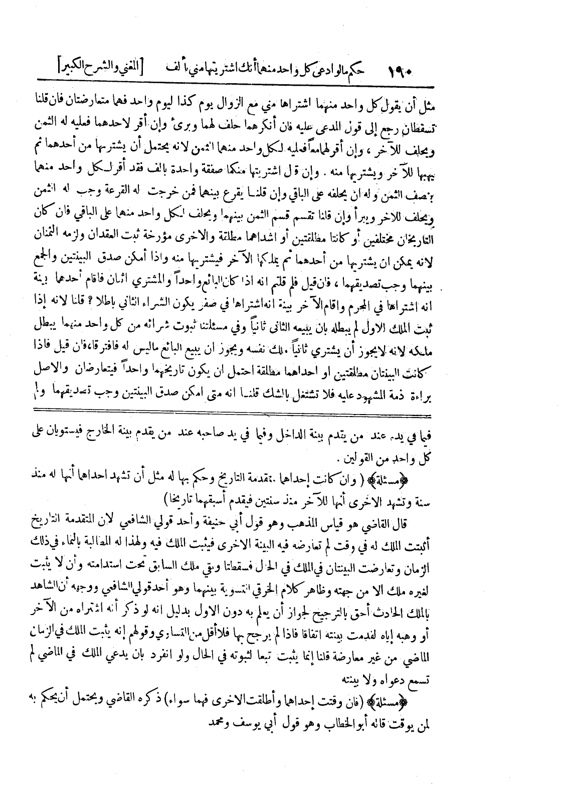 (مسألة) (وإن كانت إحداهما متقدمة التاريخ وحكم بها له مثل أن تشهد إحداهما أنها له منذ سنة وتشهد الأخرى أنها للآخر منذ سنتين فيقدم أسبقهما تاريخاً) قال القاضي هو قياس المذهب وهو قول أبي حنيفة وأحد قولي الشافعي لأن المتقدمة التاريخ أثبتت الملك له في وقت لم تعارضه فيه البينة الأخرى فيثبت الملك فيه ولهذا له المطالبة بالنماء في ذلك الزمان وتعارضت البينتان في الملك في الحال فسقطتا وبقي ملك السابق تحت استدامته وأن لا يثبت لغيره ملك إلا من جهته وظاهر كلام الخرقي التسوية بينهما وهو أحد قولي الشافعي ووجهه أن الشاهد بالملك الحادث أحق بالترجيح لجواز أن يعلم به دون الأول بدليل أنه لو ذكر أنه اشتراه من الآخر أو وهبه إياه لقدمت بينته اتفاقاً فإذا لم يرجح بها فلا أقل من التساوي وقولهم إنه يثبت الملك في الزمان الماضي من غير معارضة قلنا إنما يثبت تبعاً لثبوته في الحال ولو انفرد بأن يدعي الملك في الماضي لم تسمع دعواه ولا بينته (مسألة) (فإن وقتت إحداهما وأطلقت الأخرى فهما سواء) ذكره القاضي ويحتمل أن يحكم به لمن يوقت قاله أبو الخطاب وهو قول أبي يوسف ومحمد