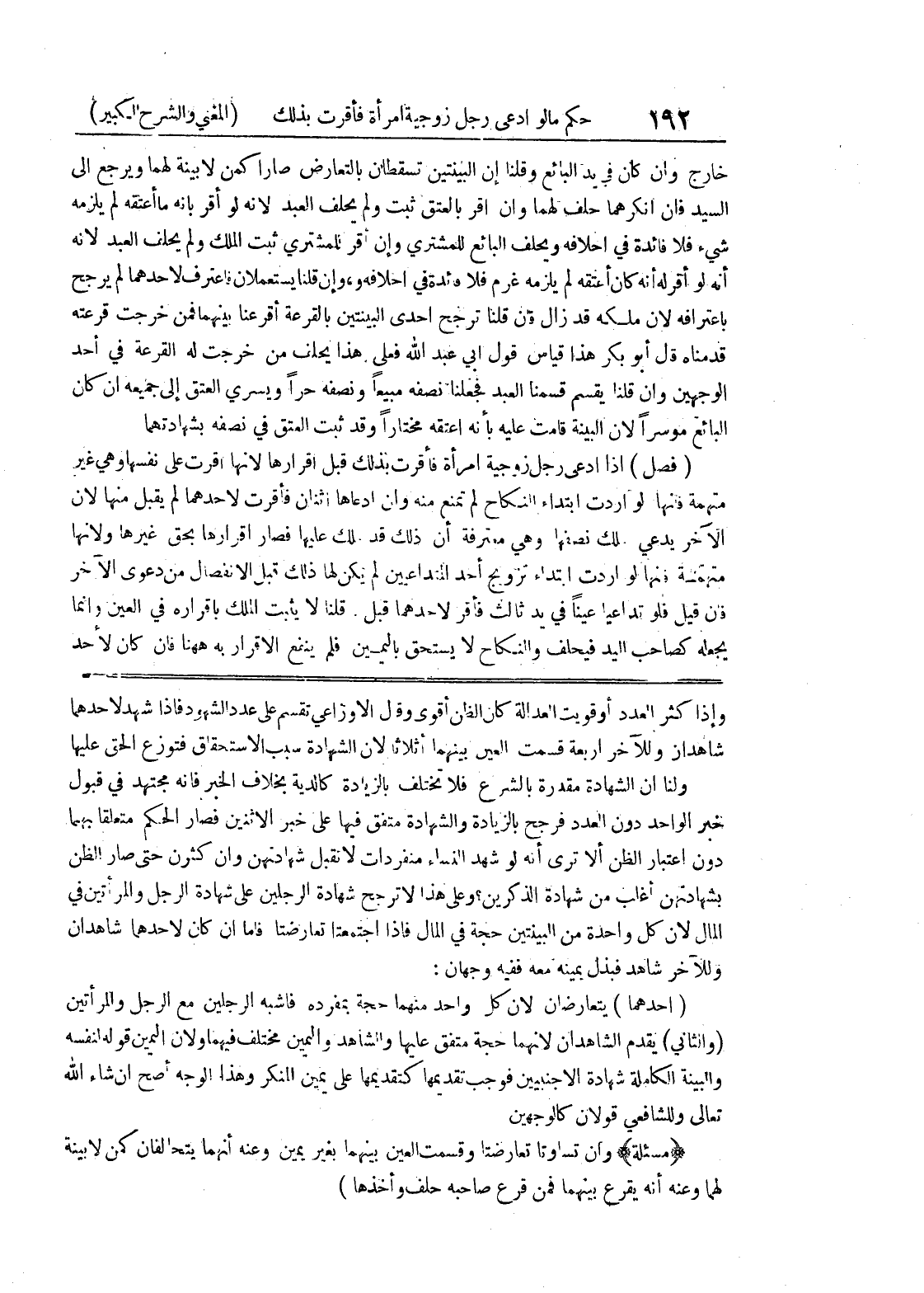 بشهادتهن أغلب من شهادة الذكرين؟ وعلى هذا لا ترجح شهادة الرجلين على شهادة الرجل والمرأتين في المال لأن كل واحدة من البينتين حجة في المال فإذا اجتمعتا تعارضتا فأما إن كان لأحدهما شاهدان وللآخر شاهد فبذل يمينه معه ففيه وجهان: (أحدهما) يتعارضان لأن كل واحد منهما حجة بمفرده فأشبه الرجلين مع الرجل والمرأتين (والثاني) يقدم الشاهدان لأنهما حجة متفق عليها والشاهد واليمين مختلف فيهما ولأن اليمين قوله لنفسه والبينة الكاملة شهادة الأجنبيين فوجب تقديمها كتقديمها على يمين المنكر وهذا الوجه أصح إن شاء الله تعالى وللشافعي قولان كالوجهين (مسألة) وإن تساوتا تعارضتا وقسمت العين بينهما بغير يمين وعنه أنهما يتحالفان كمن لا بينة لهما وعنه أنه يقرع بينهما فمن قرع صاحبه حلف وأخذها)