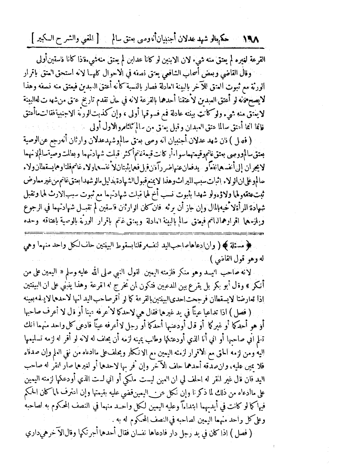 (مسألة) (وإن ادعاها صاحب اليد لنفسه وقلنا يسقوط البينتين حلف لكل واحد منهما وهي له وهو قول القاضي) لأنه صاحب اليد وهو منكر فلزمته اليمين لقول النبي صلى الله عليه وسلم (اليمين على من أنكر) وقال أبو بكر بل يقرع بين المدعبين فتكون لمن تخرج له القرعة وهذا ينبني على أن البينتين إذا تعارضتا لا يسقطان فرجحت إحدى البينتين بالقرعة كما لو أقر صاحب اليد أنها لاحدهما لا يسلمه بعينه (فصل) إذا تداعيا عيناً في يد غيرهما فقال هي لأحدكما لاعرفه عيناً أو قال لا أعرف صاحبها