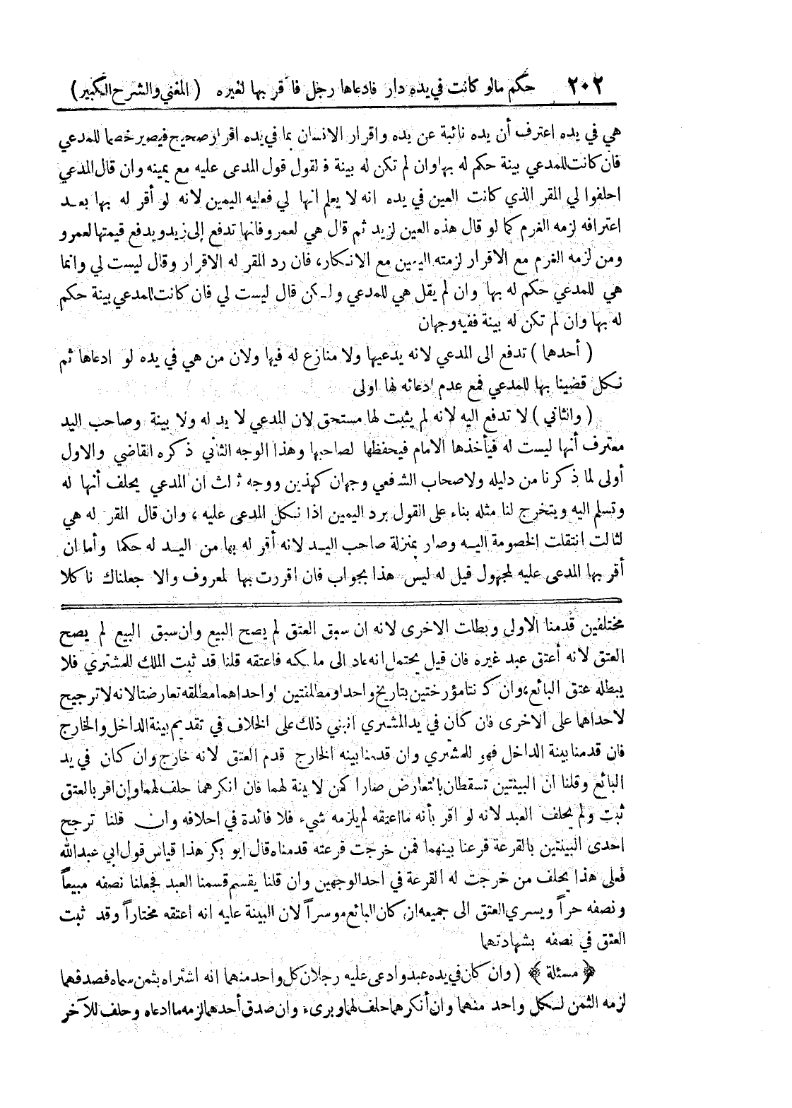 مختلفين قدمنا الأولى وبطلت الأخرى لأنه إن سبق العتق لم يصح البيع وإن سبق البيع لم يصح العتق لأنه اعتق عبد غيره فإن قيل يحتمل أنه عاد إلى ملكه فأعتقه قلنا قد ثبت الملك للمشتري فلا يبطله عتق البائع، وإن كانتا مؤرختين بتاريخ واحد أو مطلقتين أو إحداهما مطلقة تعارضتا لأنه لا ترجيح لإحداهما على الأخرى فان كان في يد المشتري انبنى ذلك على الخلاف في تقديم بينة الداخل والخارج فإن قدمنا بينة الداخل فهو للمشتري وإن قدمنا بينة الخارج قدم العتق لأنه خارج وإن كان في يد البائع وقلنا إن البينتين تسقطان بالتعارض صارا كمن لا بينة لهما فإن أنكرهما حلف لهما وإن أقر بالعتق ثبت ولم يحلف العبد لأنه لو أقر بأنه ما أعتقه لم يلزمه شئ فلا فائدة في إحلافه وإن قلنا ترجح إحدى البينتين بالقرعة قرعنا بينهما فمن خرجت قرعته قدمناه قال أبو بكر هذا قياس قول أبي عبد الله فعلى هذا يحلف من خرجت له القرعة في أحد الوجهين وإن قلنا يقسم قسمنا العبد فجعلنا نصفه مبيعاً ونصفه حراً ويسري العتق إلى جميعه إن كان البائع موسراً لأن البينة عليه أنه أعتقه مختاراً وقد ثبت العتق في نصفه بشهادتهما (مسألة) (وإن كان في يده عبد وادعى عليه رجلان كل واحد منهما أنه اشتراه بثمن سماه فصدقهما