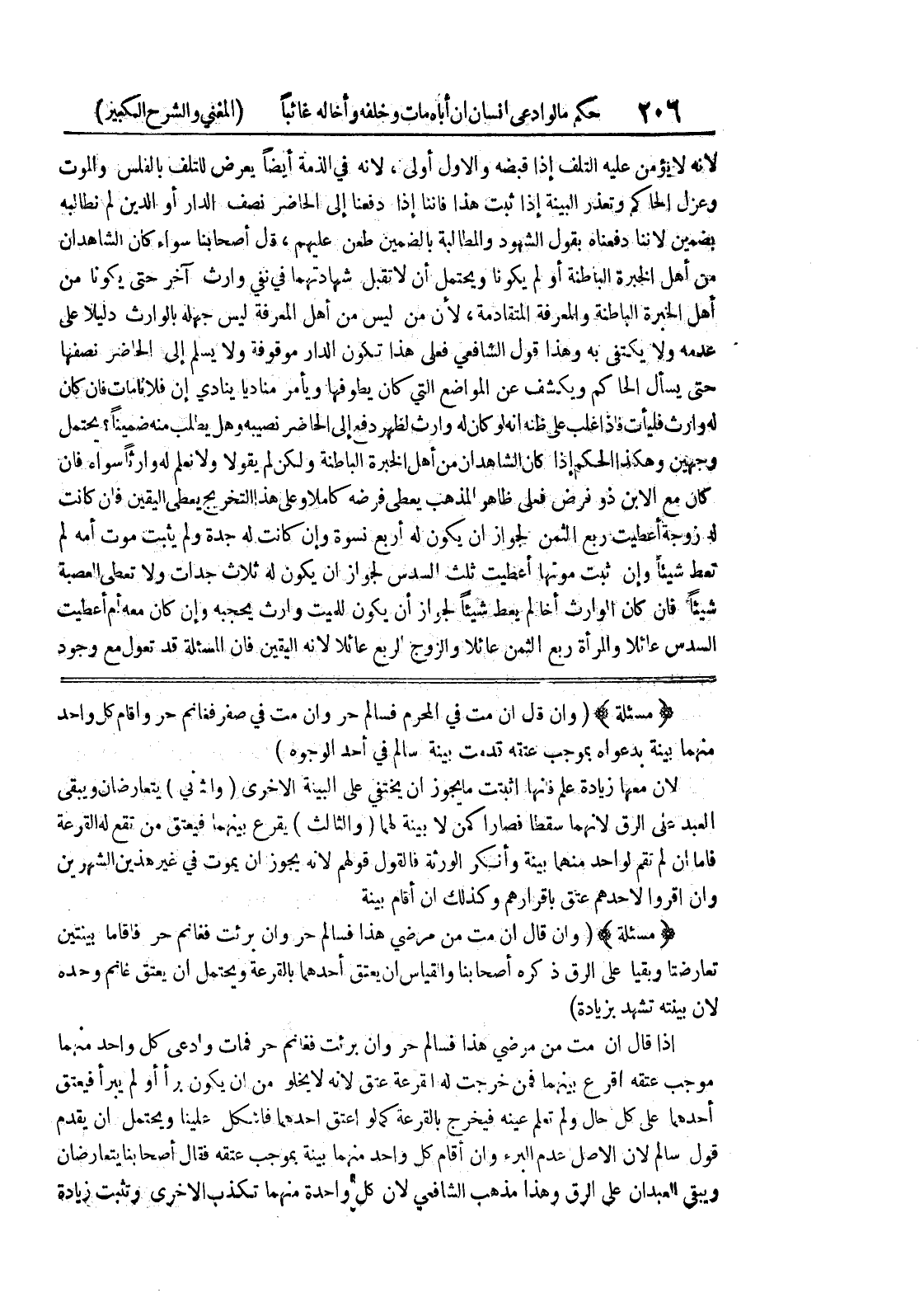(مسألة) (وإن قال إن مت في المحرم فسالم حر وإن مت في صفر فغانم حر وأقام كل واحد منهما بينة بدعواه بموجب عتقه قدمت بينة سالم في أحد الوجوه) لأن معها زيادة علم فإنها أثبتت ما يجوز أن يختفي على البينة الآخرى (والثاني) يتعارضان ويبقى العبد على الرق لأنهما سقطا فصارا كمن لا بينة لهما (والثالث) يقرع بينهما فيعتق من تقع له القرعة فأما إن لم تقم لواحد منهما بينة وأنكر الورثة فالقول قولهم لأنه يجوز أن يموت في غير هذين الشهرين وإن أقروا لأحدهم عتق بإقرارهم وكذلك إن أقام بينة (مسألة) (وإن قال إن مت من مرضي هذا فسالم حر وإن برئت فغانم حر فأقاما بينتين تعارضتا وبقيا على الرق ذكره أصحابنا والقياس أن يعتق أحدهما بالقرعة ويحتمل أن يعتق غانم وحده لأن بينته تشهد بزيادة) إذا قال إن مت من مرضي هذا فسالم حر وإن برئت فغانم حر فمات وادعى كل واحد منهما موجب عتقه اقرع بينهما فمن خرجت له القرعة عتق لأنه لا يخلو من أن يكون برأ أو لم يبرأ فيعتق أحدهما على كل حال ولم تعلم عينه فيخرج بالقرعة كما لو اعتق احدهما فاشكل علينا ويحتمل أن يقدم قول سالم لأن الأصل عدم البرء وإن أقام كل واحد منهما بينة بموجب عتقه فقال أصحابنا يتعارضان ويبقى العبدان على الرق وهذا مذهب الشافعي لأن كل واحدة منهما تكذب الأخرى وتثبت زيادة