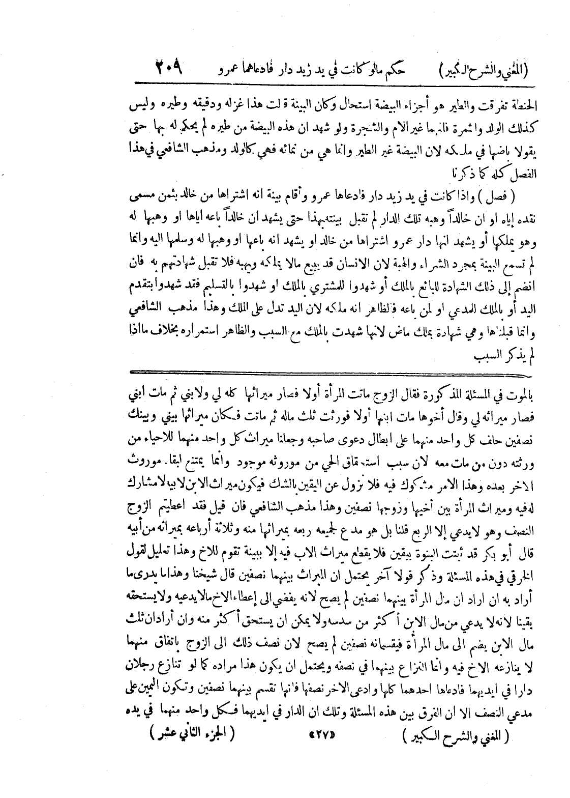 بالموت في المسألة المذكورة فقال الزوج ماتت المرأة أولاً فصار ميراثها كله لي ولأبني ثم مات ابني فصار ميراثه لي وقال أخوها مات ابنها أولاً فورثت ثلث ماله ثم ماتت فكان ميراثها بيني وبينك نصفين حلف كل واحد منهما على إبطال دعوى صاحبه وجعلنا ميراث كل واحد منهما للأحياء من ورثته دون من مات معه لأن سبب استحقاق الحي من موروثه موجود وإنما يمتنع لبقاء موروث الآخر بعده وهذا الأمر مشكوك فيه فلا نزول عن اليقين بالشك فيكون ميراث الابن لأبيه لا مشارك له فيه وميراث المرأة بين أخيها وزوجها نصفين وهذا مذهب الشافعي فإن قيل فقد أعطيتم الزوج النصف وهو لا يدعي إلا الربع قلنا بل هو مدع لجميعه ربعه بميراثها منه وثلاثة أرباعه بميراثه من أبيه قال أبو بكر قد ثبتت البنوة بيقين فلا يقطع ميراث الأب فيه إلا ببينة تقوم للأخ وهذا تعليل لقول الخرقي في هذه المسألة وذكر قولاً آخر يحتمل أن الميراث بينهما نصفين قال شيخنا وهذا ما يدري ما أراد به إن أراد أن مال المرأة بينهما نصفين لم يصح لأنه يفضي إلى إعطاء الأخ ما لا يدعيه ولا يستحقه يقيناً لأنه لا يدعي من مال الابن أكثر من سدسه ولا يمكن أن يستحق أكثر منه وان أراد أن ثلث مال الابن يضم إلى مال المرأة فيقسمانه نصفين لم يصح لأن نصف ذلك إلى الزوج باتفاق منهما لا ينازعه الأخ فيه وإنما النزاع بينهما في نصفه ويحتمل أن يكون هذه مراده كما لو تنازع رجلان داراً في أيديهما فادعاها احدهما كلها وادعى الآخر نصفها فإنها تقسم بينهما نصفين وتكون اليمين على مدعي النصف إلا أن الفرق بين هذه المسألة وتلك أن الدار في أيديهما فكل واحد منهما في يد