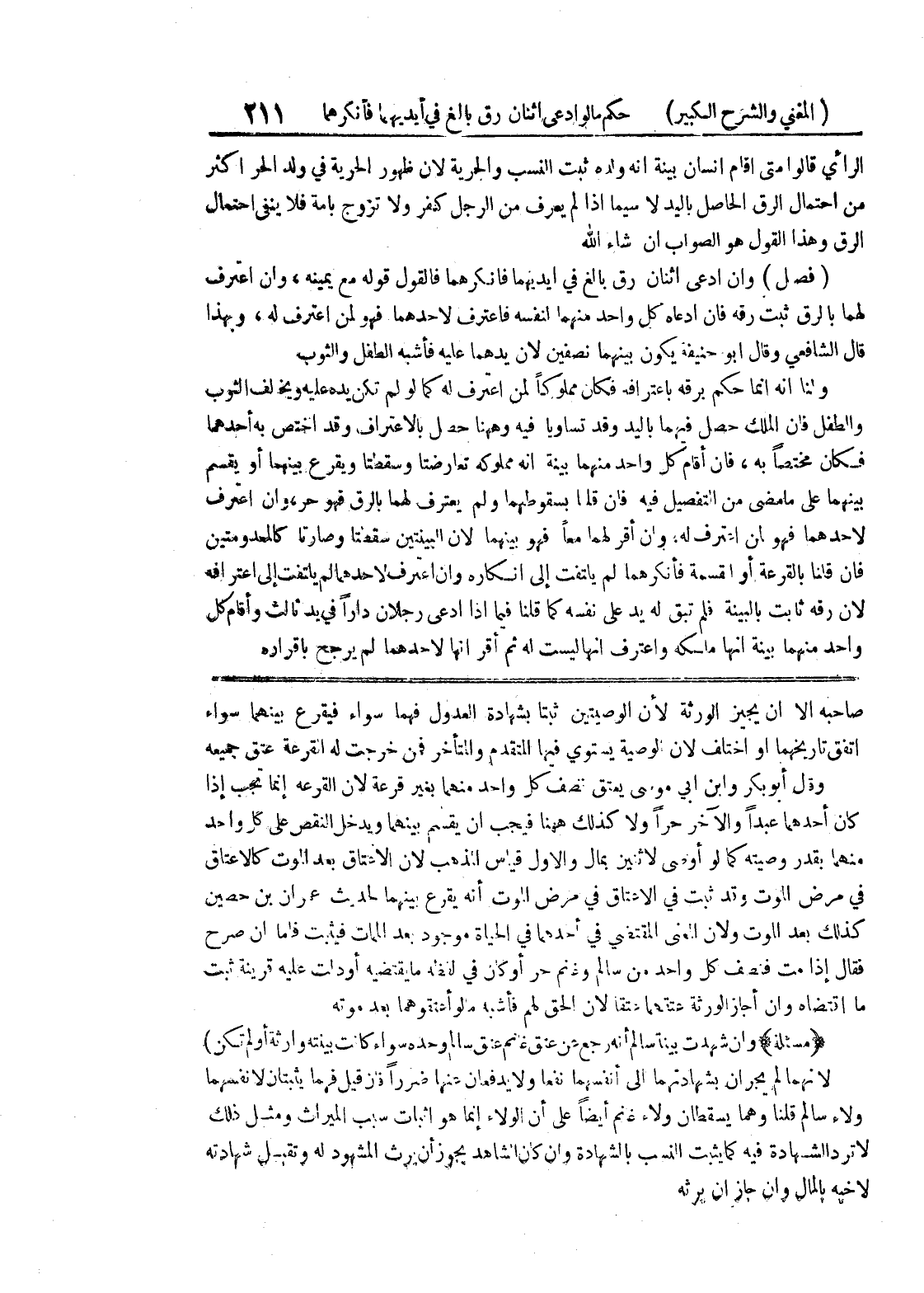 صاحبه إلا أن يجيز الورثة لأن الوصيتين ثبتا بشهادة العدول فهما سواء فيقرع بينهما سواء اتفق تاريخهما أو اختلف لأن الوصية يستوي فيها المتقدم والمتأخر فمن خرجت له القرعة عتق جميعه وقال أبو بكر وابن أبي موسى يعتق نصف كل واحد منهما بغير قرعة لأن القرعة إنما تجب إذا كان أحدهما عبداً والآخر حراً ولا كذلك ههنا فيجب أن يقسم بينهما ويدخل النقص على كل واحد منهما بقدر وصيته كما لو أوصى لاثنين بمال والأول قياس المذهب لأن الاعتاق بعد الموت كالإعتاق في مرض الموت وقد ثبت في الاعتاق في مرض الموت أنه يقرع بينهما لحديث عمران بن حصين كذلك بعد الموت ولأن المعنى المقتضي في أحدهما في الحياة موجود بعد الممات فيثبت فلما أن صرح فقال إذا مت فنصف كل واحد من سالم وغانم حر أو كان في لفظه ما يقتضيه أو دلت عليه قرينة ثبت ما اقتضاه وإن أجاز الورثة عتقهما عتقا لأن الحق لهم فأشبه ما لو أعتقوهما بعد موته (مسألة) وإن شهدت بينة سالم أنه رجع عن عتق غانم عتق سالم وحده سواء كانت بينته وارثة أو لم تكن) لأنهما لم يجران بشهادتهما إلى أنفسهما نفعاً ولا يدفعان عنها ضرراً فإن قيل فهما يثبتان لأنفسهما ولاء سالم قلنا وهما يسقطان ولاء غانم أيضاً على أن الولاء إنما هو اثبات سبب الميراث ومثل ذلك لا ترد الشهادة فيه كما يثبت النسب بالشهادة وإن كان الشاهد يجوز أن يرث المشهود له وتقبل شهادته