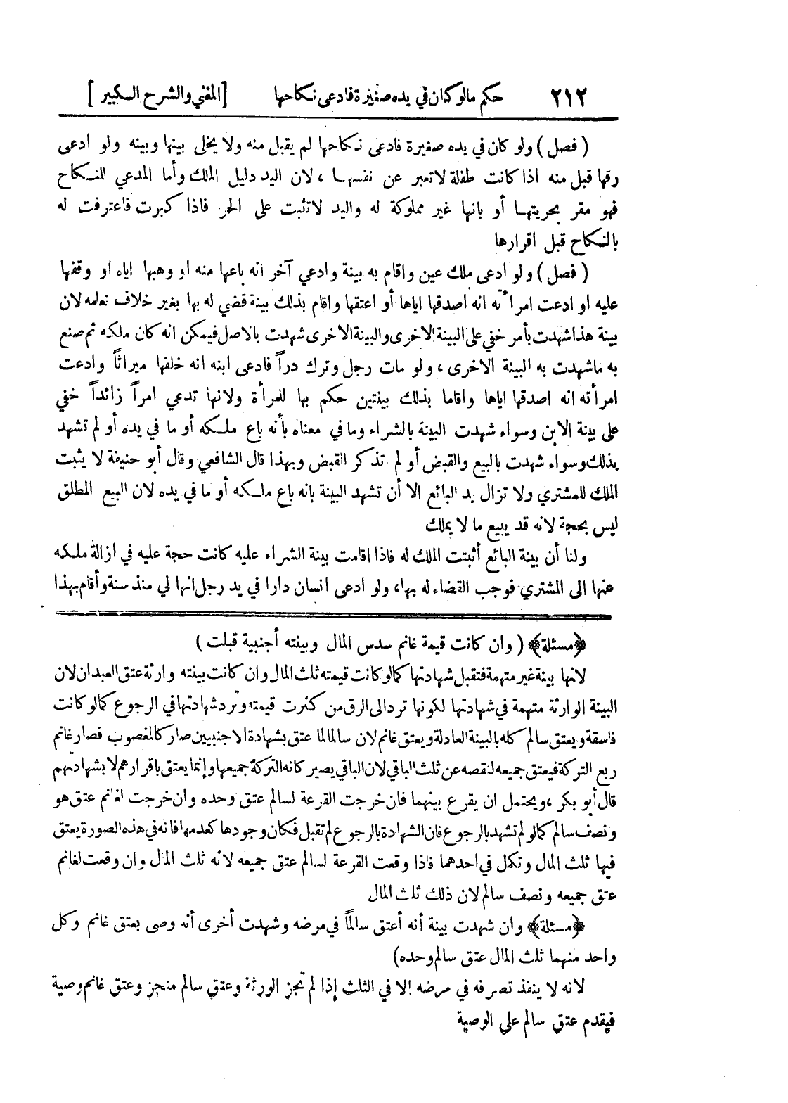 (مسألة) (وإن كانت قيمة غانم سدس المال وبينته أجنبية قبلت) لانها بينة غير متهمة فتقبل شهادتها كما لو كانت قيمته ثلث المال وإن كانت بينته وارثة عتق العبدان لأن البينة الوارثة متهمة في شهادتها لكونها ترد إلى الرق من كثرت قيمته وترد شهادتها في الرجوع كما لو كانت فاسقة ويعتق سالم كله بالبينة العادلة ويعتق غانم لان سالما لما عتق بشهادة الاجنبيين صار كالمغصوب فصار غانم ربع التركة فيعتق جميعه لنقصه عن ثلث الباقي لأن الباقي يصير كأنه التركة جميعها وإنما يعتق بإقرارهم لا بشهادتهم قال أبو بكر، ويحتمل أن يقرع بينهما فإن خرجت القرعة لسالم عتق وحده وإن خرجت لغانم عتق هو ونصف سالم كما لو لم تشهد بالرجوع فإن الشهادة بالرجوع لم تقبل فكان وجودها كعدمها فإنه في هذه الصورة يعتق فيها ثلث المال وتكمل في أحدهما فإذا وقعت القرعة لسالم عتق جميعه لأنه ثلث المال وإن وقعت لغانم عتق جميعه ونصف سالم لأن ذلك ثلث المال (مسألة) وإن شهدت بينة أنه أعتق سالماً في مرضه وشهدت أخرى أنه وصى بعتق غانم وكل واحد منهما ثلث المال عتق سالم وحده) لأنه لا ينفذ تصرفه في مرضه إلا في الثلث إذا لم تجز الورثة وعتق سالم منجز وعتق غانم وصية فيقدم عتق سالم على الوصية