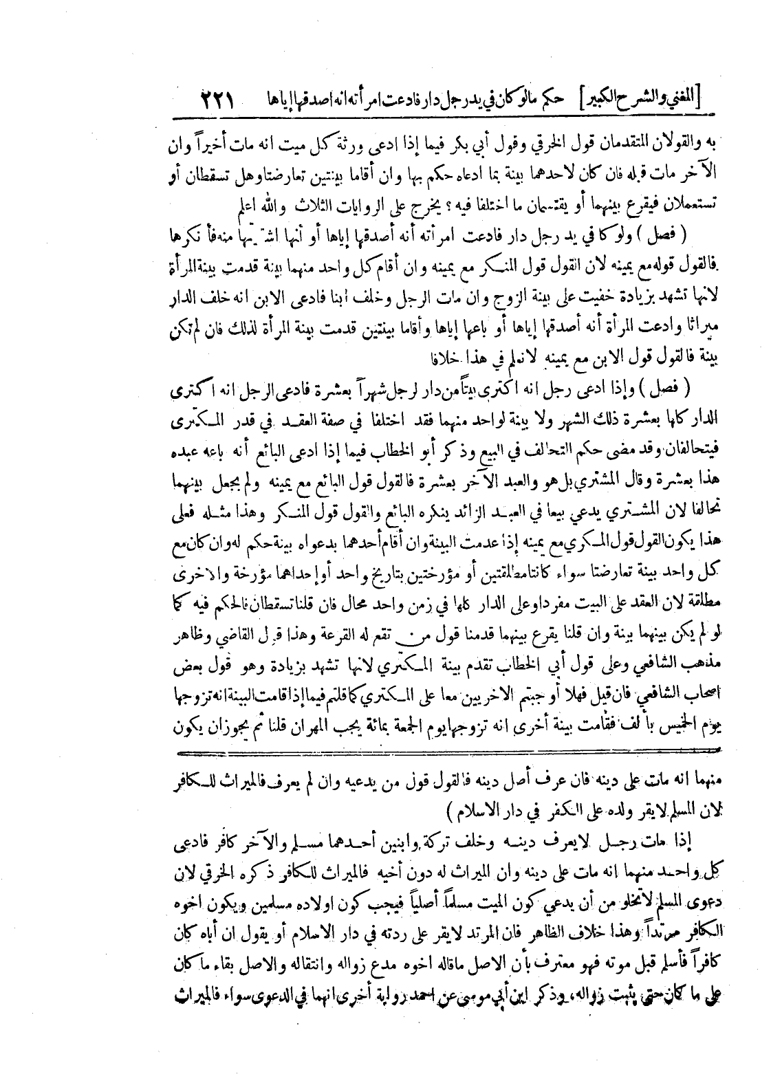 منهما أنه مات على دينه فإن عرف أصل دينه فالقول قول من يدعيه وإن لم يعرف فالميراث للكافر لأن المسلم لا يقر ولده على الكفر في دار الإسلام) إذا مات رجل لا يعرف دينه وخلف تركة وابنين أحدهما مسلم والآخر كافر فادعى كل واحد منهما أنه مات على دينه وأن الميراث له دون أخيه فالميراث للكافر ذكره الخرقي لأن دعوى المسلم لا تخلو من أن يدعي كون الميت مسلماً أصلياً فيجب كون أولاده مسلمين ويكون أخوه الكافر مرتداً وهذا خلاف الظاهر فإن المرتد لا يقر على ردته في دار الإسلام أو يقول إن أباه كان كافراً فأسلم قبل موته فهو معترف بأن الأصل ما قاله أخوه مدع زواله وانتقاله والأصل بقاء ما كان على ما كان حتى يثبت زواله، وذكر ابن أبي موسى عن أحمد رواية أخرى أنهما في الدعوى سواء فالميراث