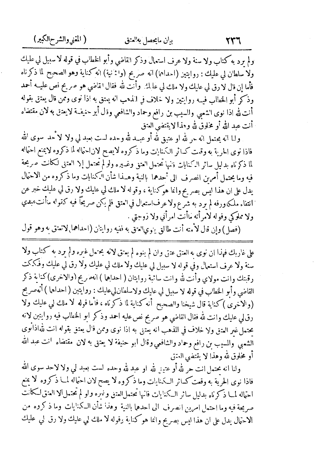 رقبتك وأنت مولاي وأنت لله وأنت سائبة روايتان (إحداهما) أنه صريح (والأخرى) كناية ذكر القاضي وابو الخطاب في قوله لا سبيل لي عليك ولا سلطان لي عليك: روايتين (إحداهما) أنه صريح (والأخرى) كناية قال شيخنا والصحيح أنه كناية لما ذكرناه، فأما قوله لا ملك لي عليك ولا رق لي عليك وأنت لله فقال القاضي هو صريح نص عليه أحمد وذكر أبو الخطاب فيه روايتين لأنه يحتمل غير العتق ولا خلاف في المذهب أنه يعتق به إذا نوى وممن قال يعتق بقوله أنت لله إذا نوى الشعبي والمسيب بن رافع وحماد والشافعي وقال أبو حنيفة لا يعتق به لأن مقتضاه أنت عبد الله أو مخلوق لله وهذا لا يقتضي العتق ولنا أنه يحتمل أنت حر لله أو عتيق لله أو عبد لله وحده لست بعبد لي ولا لأحد سوى الله فإذا نوى الحرية به وقعت كسائر الكنايات وما ذكروه لا يصح لأن احتماله لما ذكروه لا يمنع احتماله لما ذكرناه بدليل سائر الكنايات فإنها تحتمل العتق وغيره ولو لم تحتمل إلا العتق لكانت صريحة فيه وما احتمل أمرين انصرف إلى أحدهما بالنية وهذا شأن الكنايات وما ذكروه من الاحتمال يدل على أن هذا ليس بصريح وإنما هو كناية وقوله لا ملك لي عليك ولا رق لي عليك