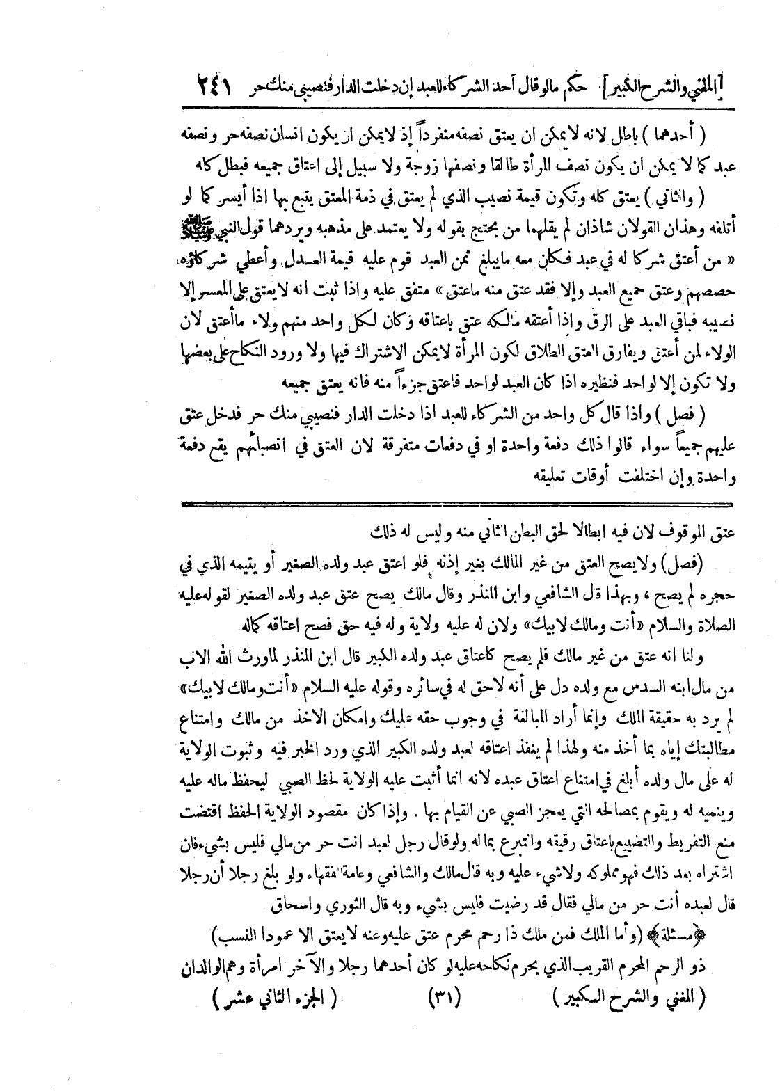 عتق الموقوف لأن فيه إبطالاً لحق البطن الثاني منه وليس له ذلك (فصل) ولا يصح العتق من غير المالك بغير إذنه فلو اعتق عبد ولده الصغير أو يتيمه الذي في حجره لم يصح، وبهذا قال الشافعي وابن المنذر وقال مالك يصح عتق عبد ولده الصغير لقوله عليه الصلاة والسلام (أنت ومالك لأبيك) ولأن له عليه ولاية وله فيه حق فسح اعتاقه كما له ولنا أنه عتق من غير مالك فلم يصح كإعتاق عبد ولده الكبير قال إبن المنذر لما روث الله الأب من مال ابنه السدس مع ولده دل على أنه لا حق له في سائره وقوله عليه السلام (أنت ومالك لأبيك) لم يرد به حقيقة الملك وإنما أراد المبالغة في وجوب حقه عليك وإمكان الأخذ من مالك وامتناع مطالبتك إياه بما أخذ منه ولهذا لم ينفذ إعتاقه لعبده ولده الكبير الذي ورد الخبر فيه وثبوت الولاية له على مال ولده أبلغ في امتناع اعتاق عبده لأنه إنما أثبت عليه الولاية لحظ الصبي ليحفظ ماله عليه وينميه له ويقوم بمصالحه التي يعجز الصبي عن القيام بها.