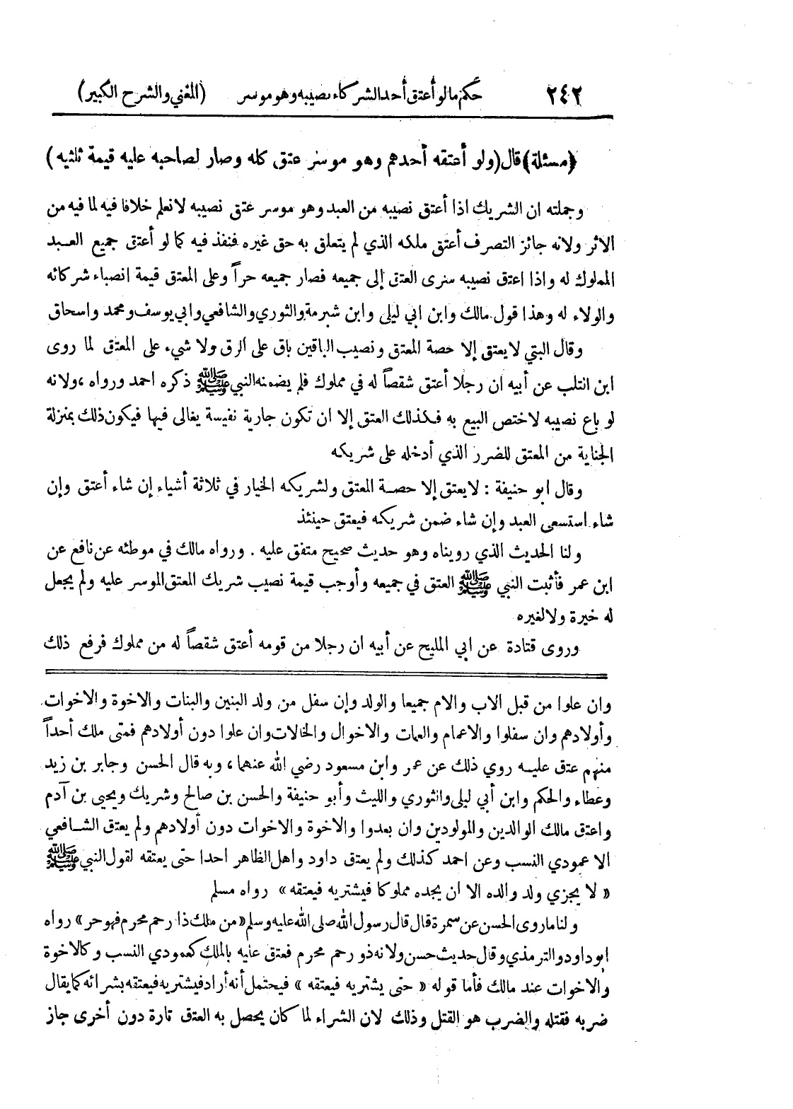 وأولادهم وإن سفلوا والاعمام والعمات والأخوال والخالات وإن علوا دون أولادهم فمتى ملك أحداً منهم عتق عليه روى ذلك عن عمر وابن مسعود رضي الله عنهما، وبه قال الحسن وجابر بن زيد وعطاء والحكم وابن أبي ليلى والثوري والليث وأبو حنيفة والحسن بن صالح وشريك ويحيى بن آدم واعتق مالك الوالدين والمولودين وإن بعدوا والاخوة والأخوات دون أولادهم ولم يعتق الشافعي إلا عمودي النسب وعن أحمد كذلك ولم يعتق داود وأهل الظاهر أحداً حتى يعتقه لقول النبي صلى الله عليه وسلم (لا يجزي ولد والده إلا أن يجده مملوكاً فيشتريه فيعتقه) رواه مسلم ولنا ما روى الحسن عن سمرة قال قال رسول الله صلى الله عليه وسلم (من ملك ذا رحم محرم فهو حر) رواه أبو داود والترمذي وقال حديث حسن ولأنه ذو رحم محرم فعتق عليه بالملك كعمودي النسب وكالاخوة والاخوات عند مالك فأما قوله (حتى يشتريه فيعتقه) فيحتمل أنه أراد فيشتريه فيعتقه بشرائه كما يقال ضربه فقتله والضرب هو القتل وذلك لأن الشراء لما كان يحصل به العتق تارة دون أخرى جاز