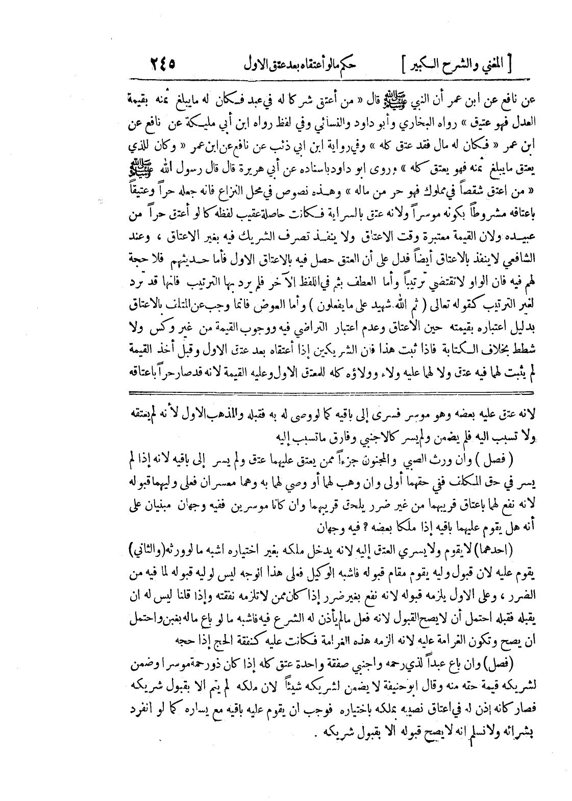 يسر في حق المكلف ففي حقهما أولى وإن وهب لهما أو وصي لهما به وهما معسران فعلى وليهما قبوله لأنه نفع لهما بإعتاق قريبهما من غير ضرر يلحق قريبهما وإن كانا موسرين ففيه وجهان مبنيان على أنه هل يقوم عليهما باقيه إذا ملكا بعضه؟ فيه وجهان (أحدهما) لا يقوم ولا يسري العتق إليه لأنه يدخل ملكه بغير اختياره أشبه ما لو ورثه (والثاني) يقوم عليه لأن قبول وليه يقوم مقام قبوله فأشبه الوكيل فعلى هذا الوجه ليس لوليه قبوله لما فيه من الضرر، وعلى الأول يلزمه قبوله لأنه نفع بغير ضرر إذا كان ممن لا تلزمه نفقته وإذا قلنا ليس له أن يقبله فقبله احتمل أن لا يصح القبول لأنه فعل ما لم يأذن له الشرع فيه فأشبه ما لو باع ماله بغبن واحتمل أن يصح وتكون الغرامة عليه لأنه ألزمه هذه الغرامة فكانت عليه كنفقة الحج إذا حجه (فصل) وإن باع عبداً لذي رحمه وأجنبي صفقة واحدة عتق كله إذا كان ذو رحمة موسراً وضمن لشريكه قيمة حقه منه وقال أبو حنيفة لا يضمن لشريكه شيئاً لأن ملكه لم يتم إلا بقبول شريكه فصار كأنه أذن له في اعتاق نصيبه بملكه باختياره فوجب أن يقوم عليه باقيه مع يساره كما لو انفرد بشرائه ولا نسلم أنه لا يصح قبوله إلا بقبول شريكه.